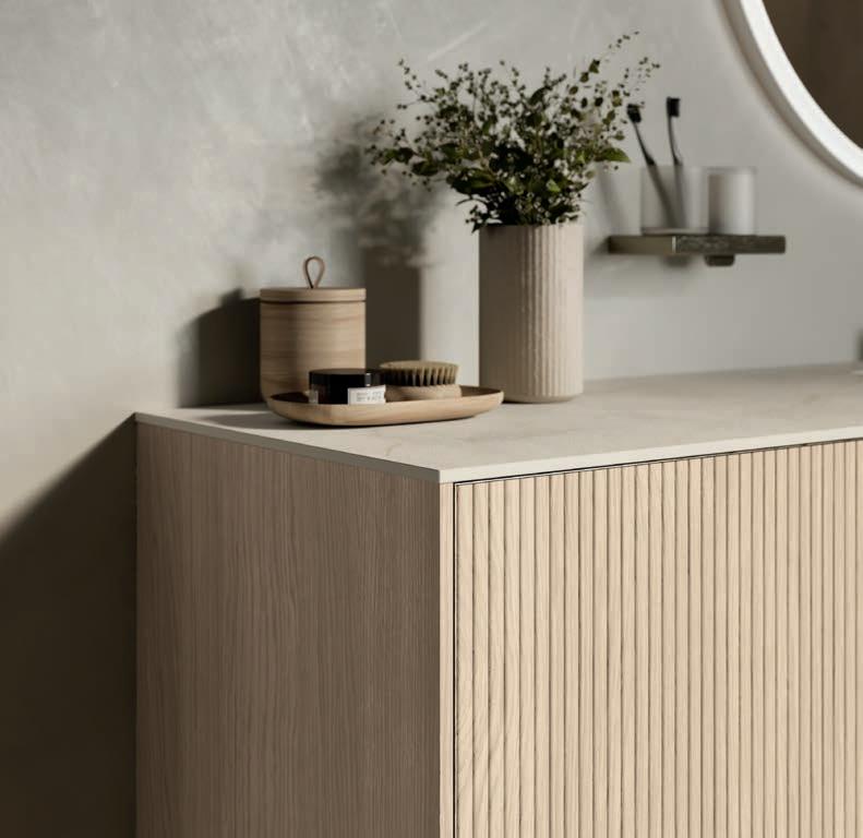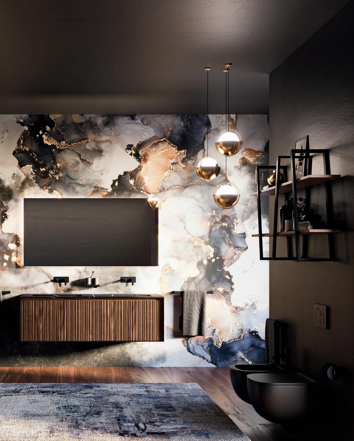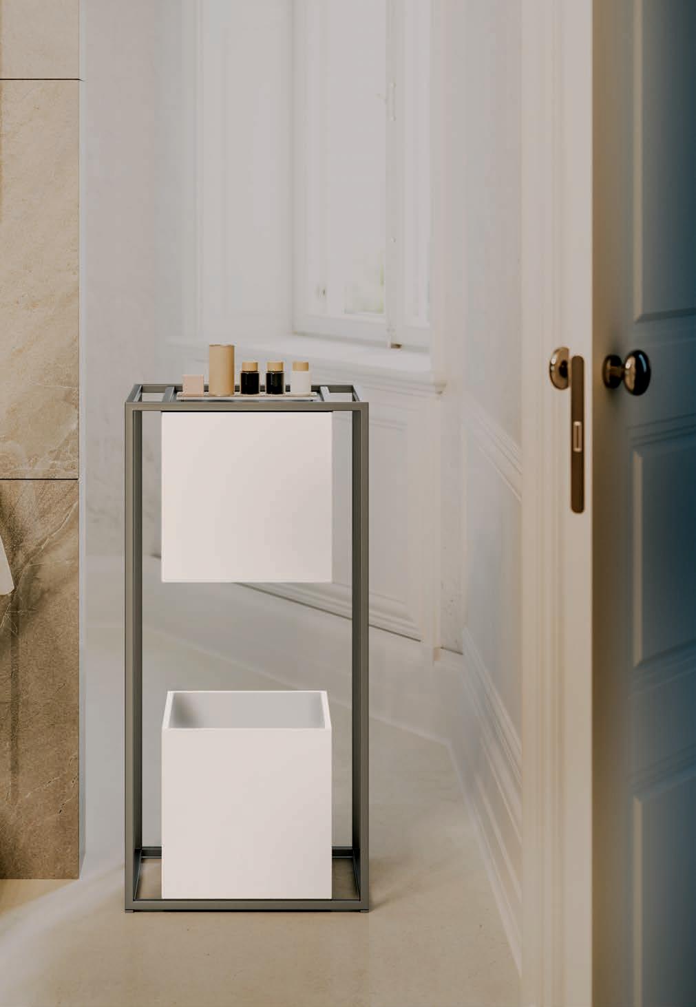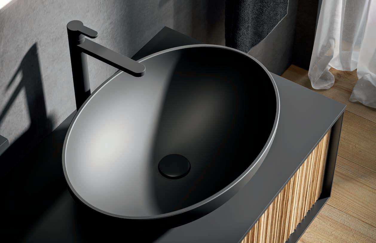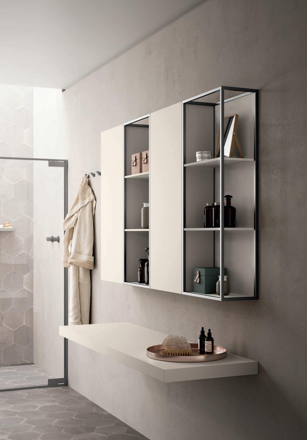 A visually impactful cladding, coating of two side panels and a bottom one, available in a wide range of finishes. Combined with the countertop, it creates a visual frame that embraces the entire composition.