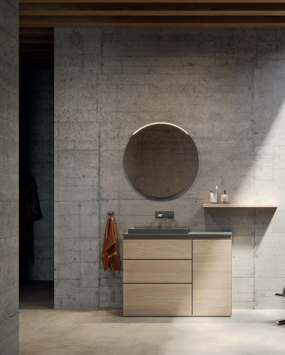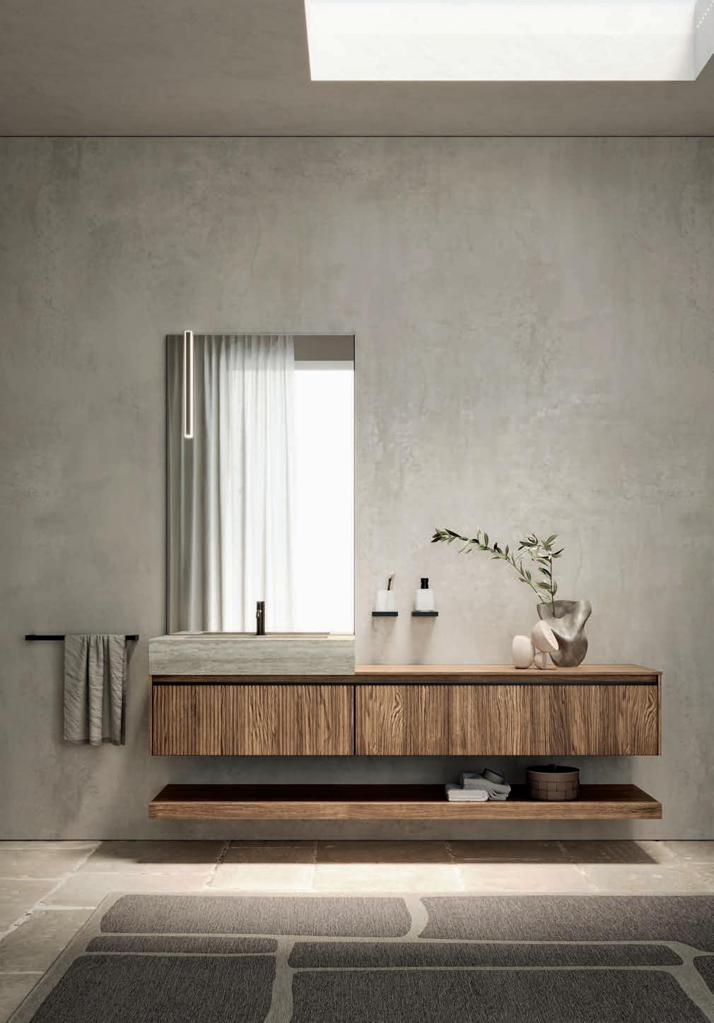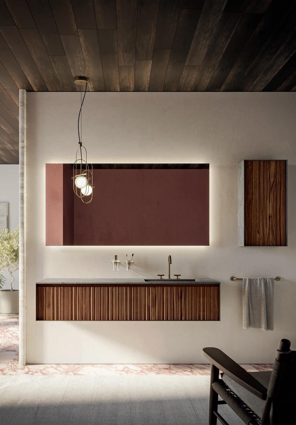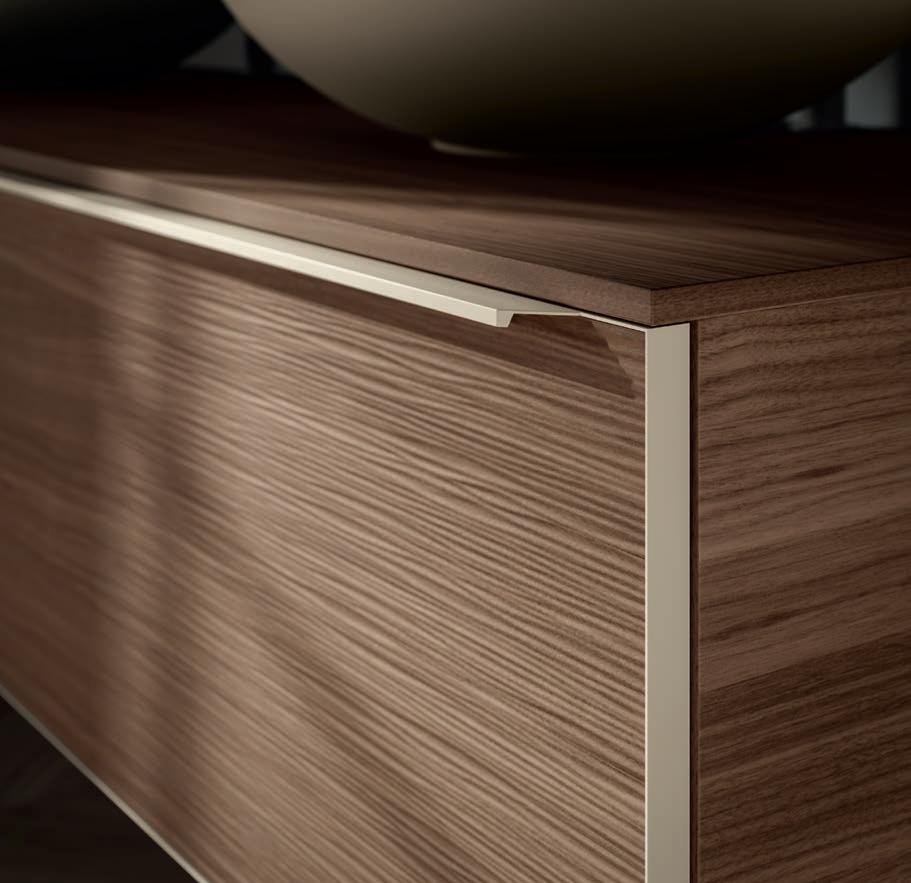 Système d’ouverture ALU. Façades en Noce Naturale éraflée avec cadre et lavabo Zante assortis en finition Terra di Luna.