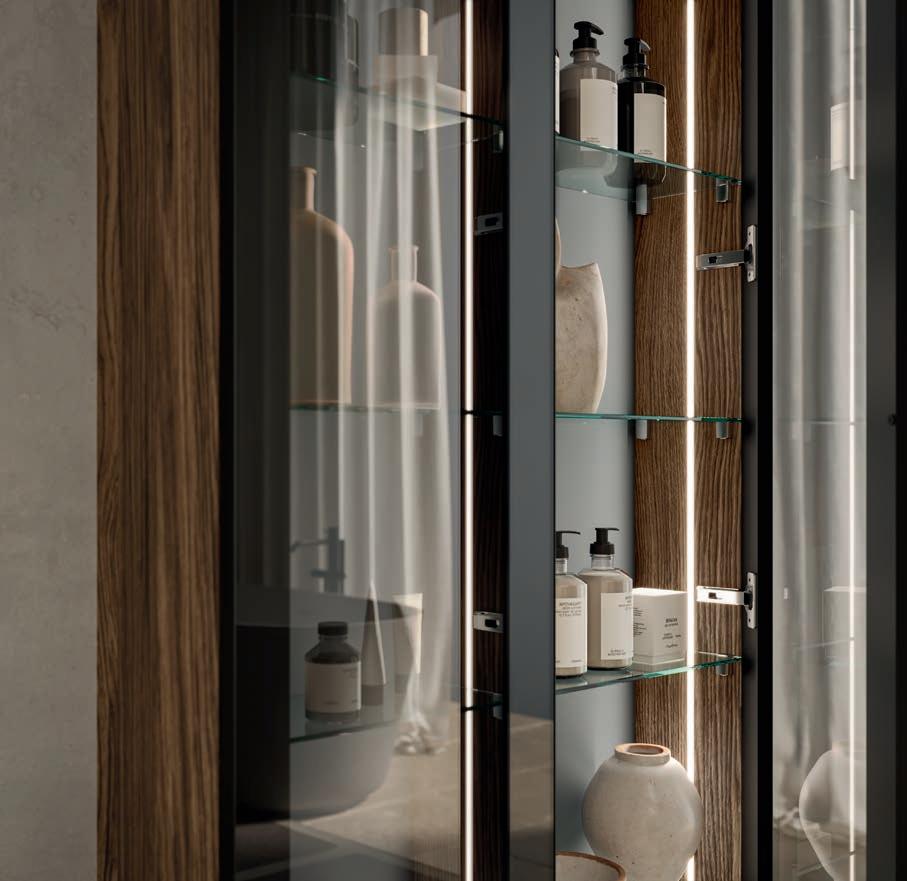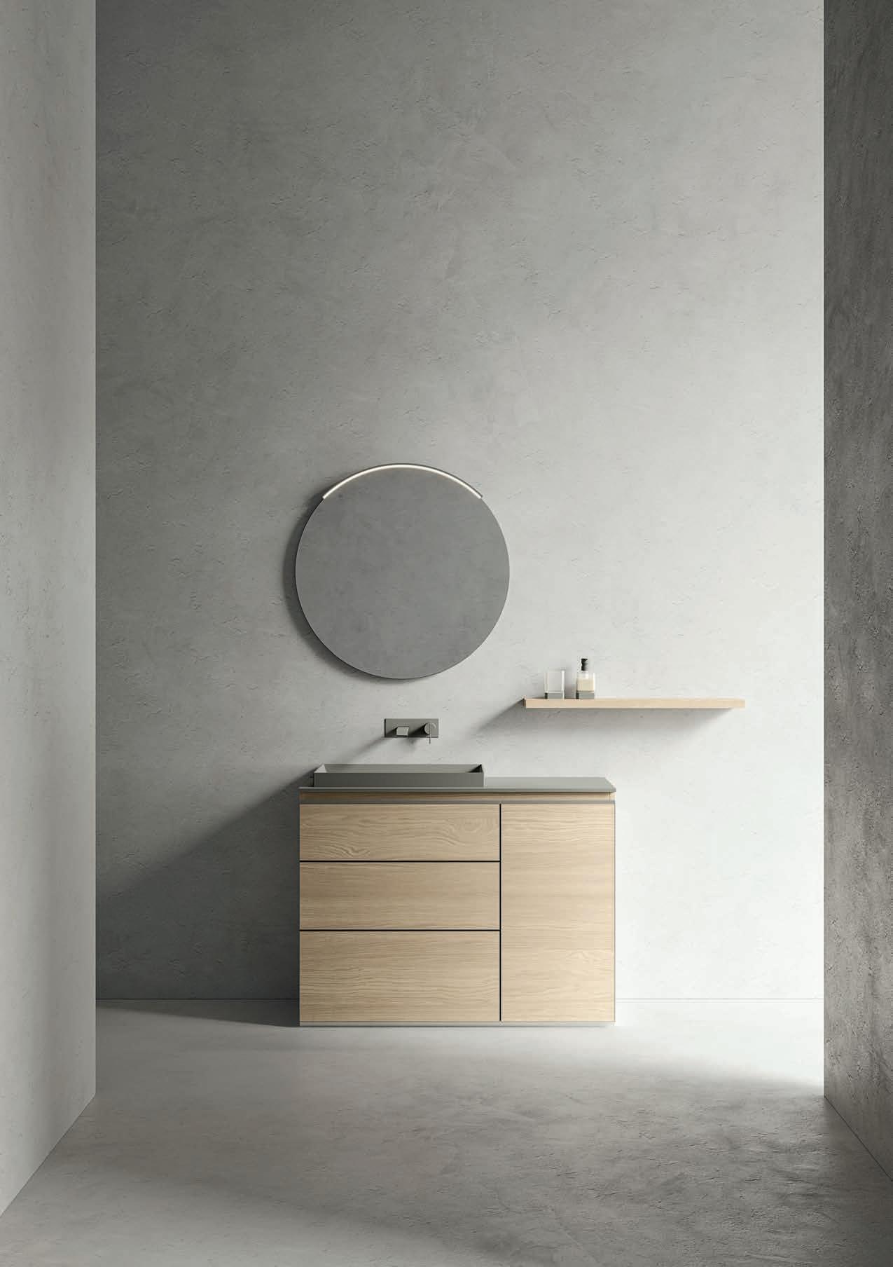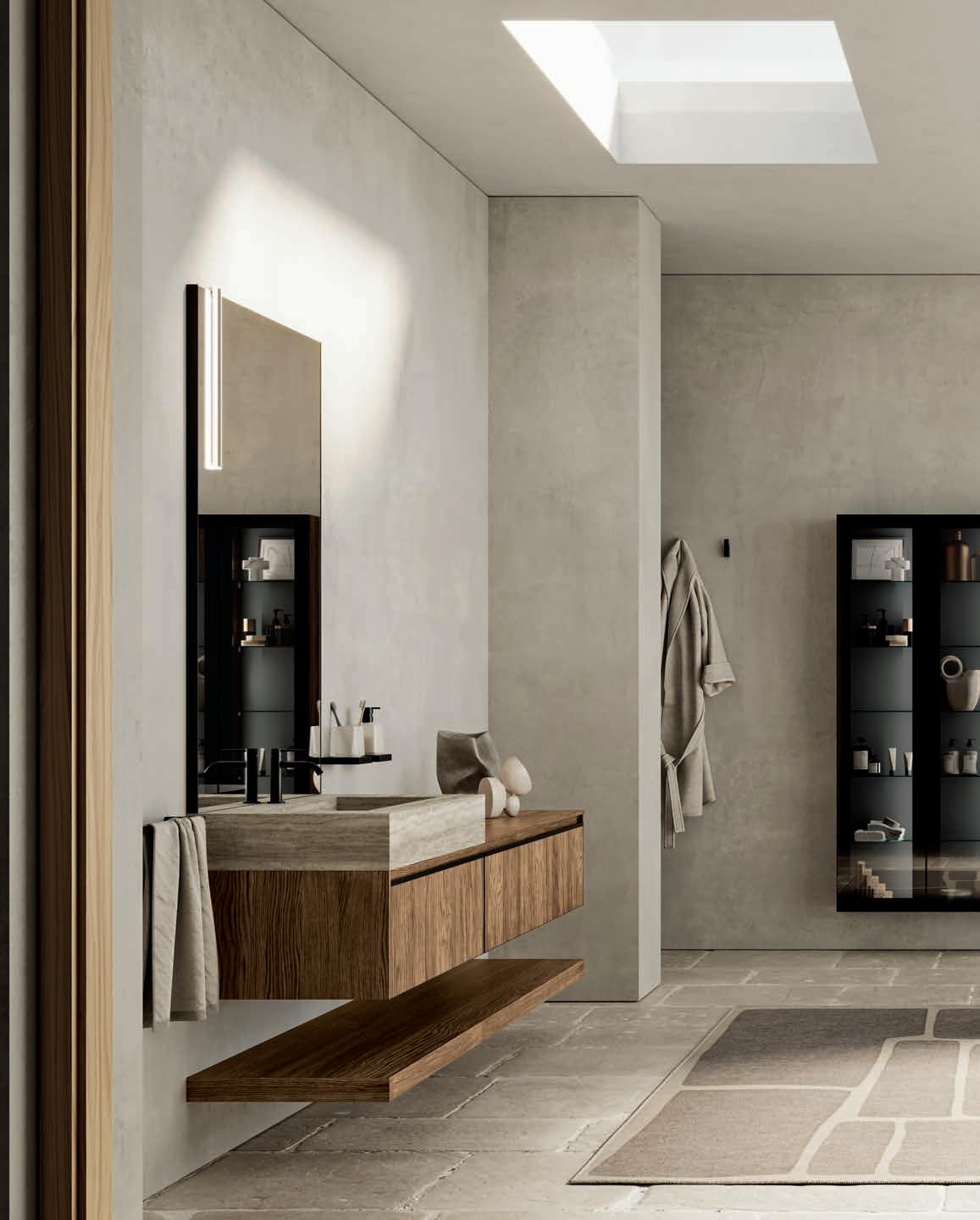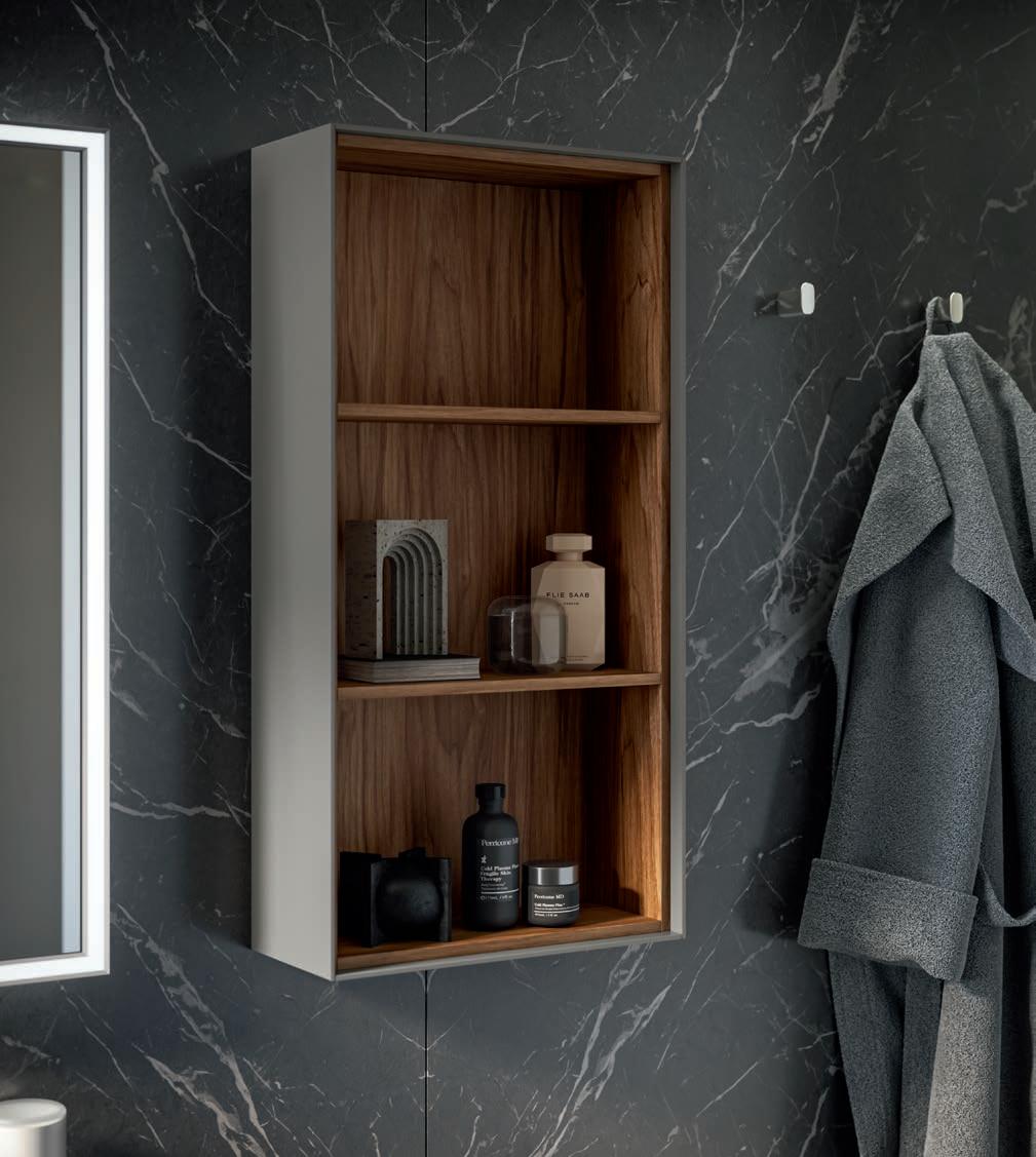 Système d’ouverture ALU. Façades en Noce Naturale éraflée avec cadre et lavabo Zante assortis en finition Terra di Luna.