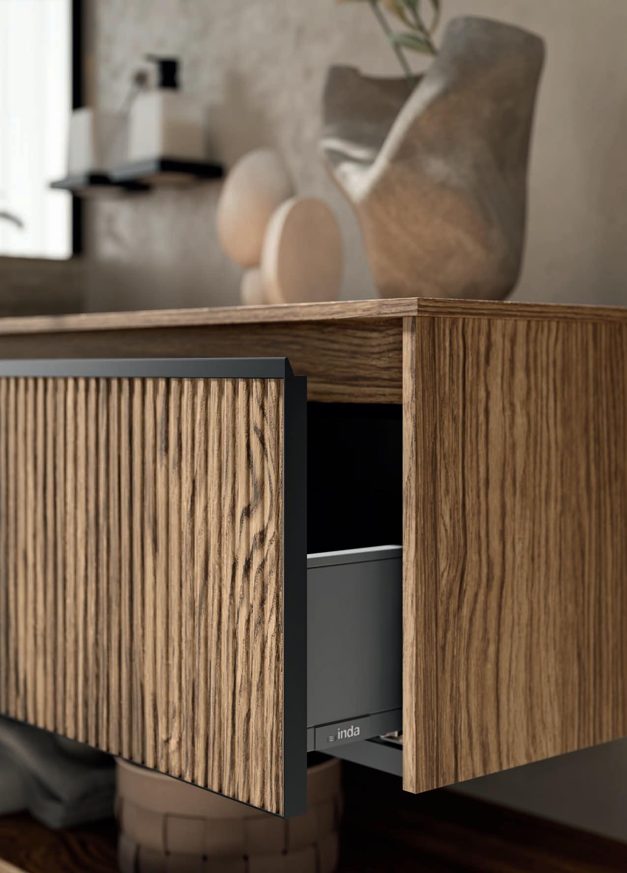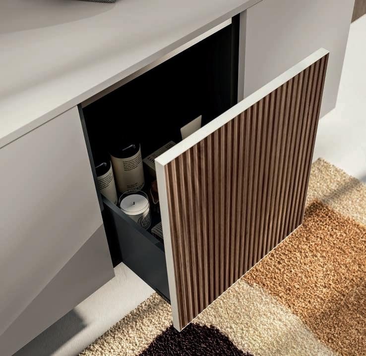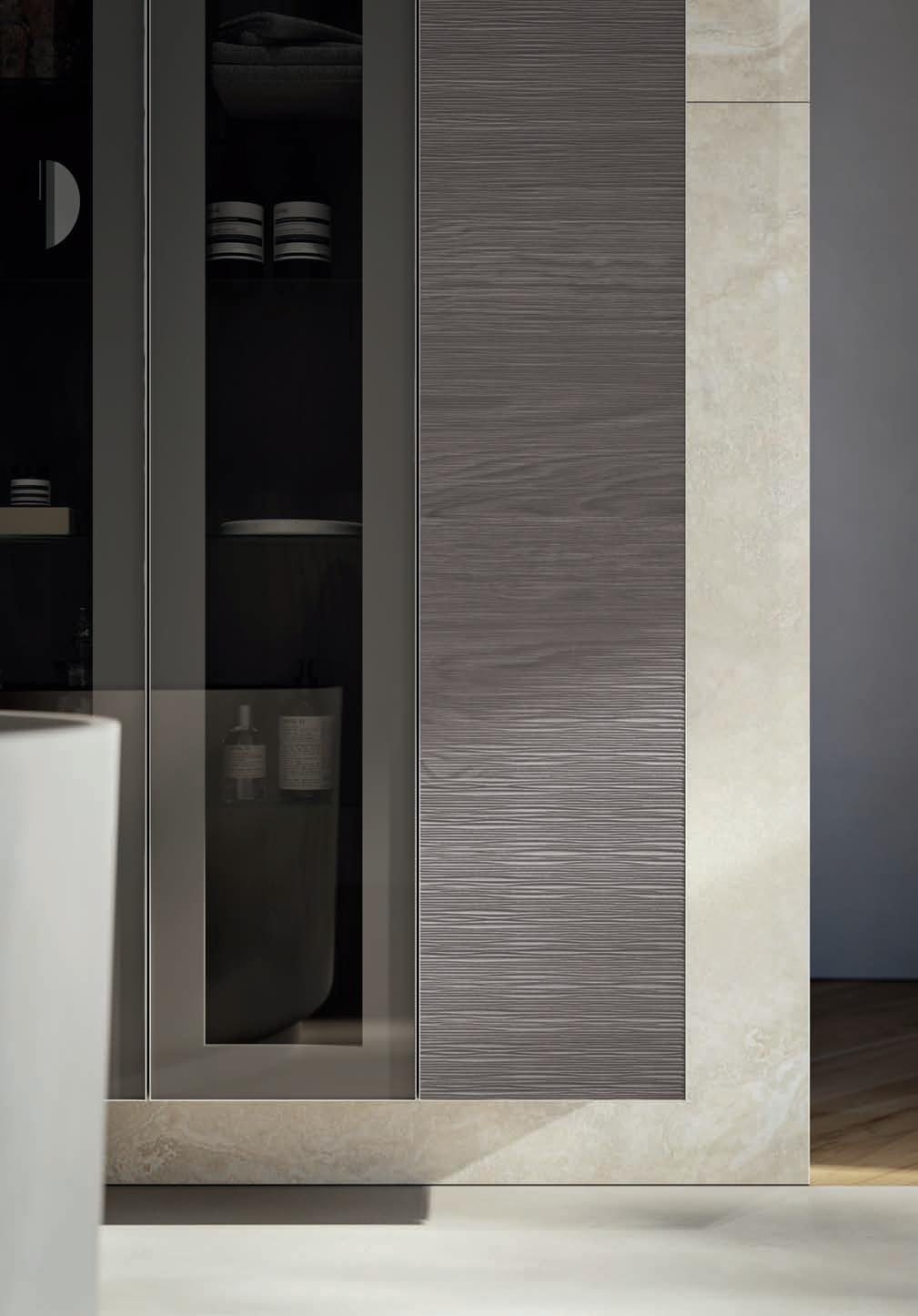 Available in ALU, PUSH and GOLA versions, the TESTADURA collection expresses three distinct aesthetic personalities, defined by the opening systems and by 3D relief-pressed woods that add depth and character. A modular and versatile system designed to offer maximum customization thanks to a wide selection of materials and finishes.