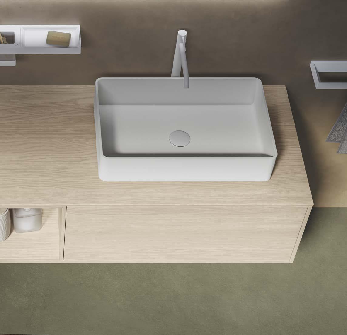 Top: linear tops for countertop washbasins or with integrated washbasins, as in the Inda collection.