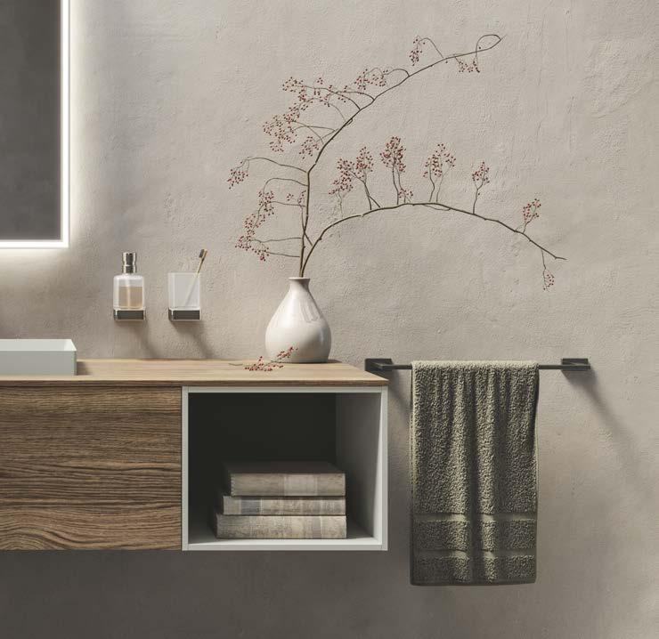 A visually impactful coating, coating of two side panels and a bottom one, available in a wide range of finishes. Combined with the countertop, it creates a visual frame that embraces the entire composition.