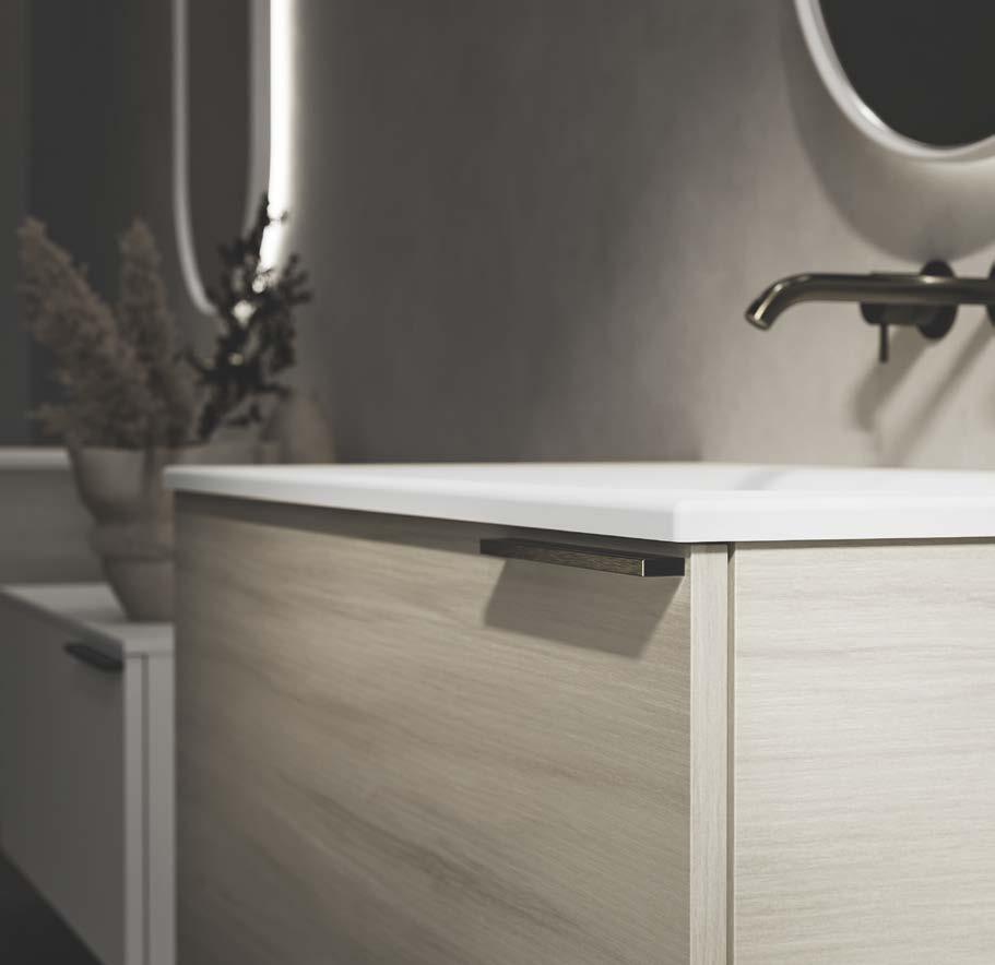 ALU-Griff, Rahmen und Divo-Accessoires in Bronze-Ausführung. Integrierte Raffaello Waschbecken in Feinsteinzeug Crema Diamante matt.