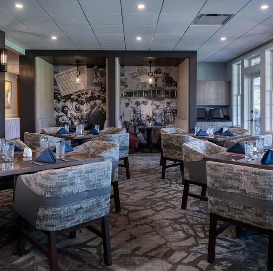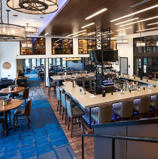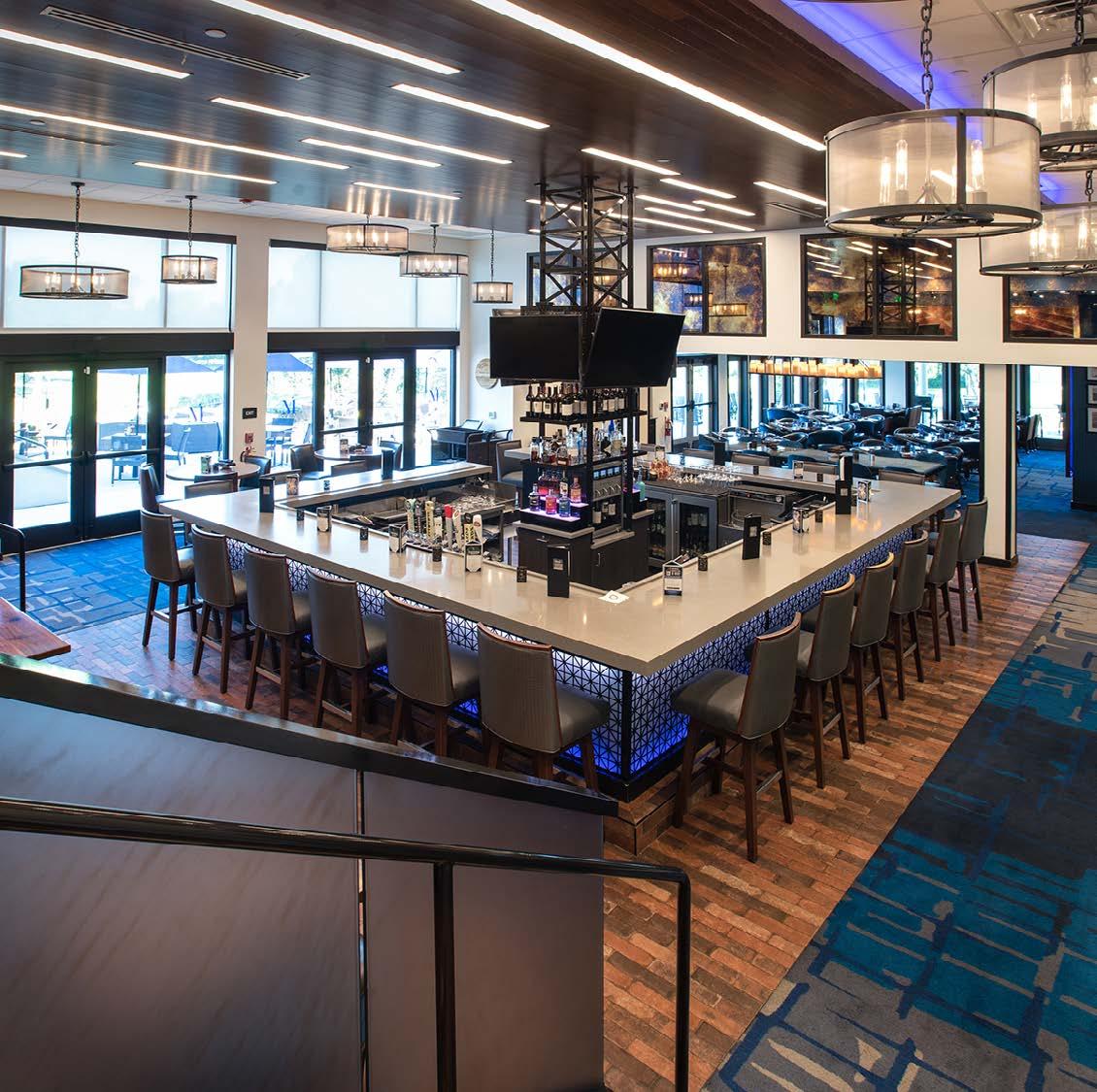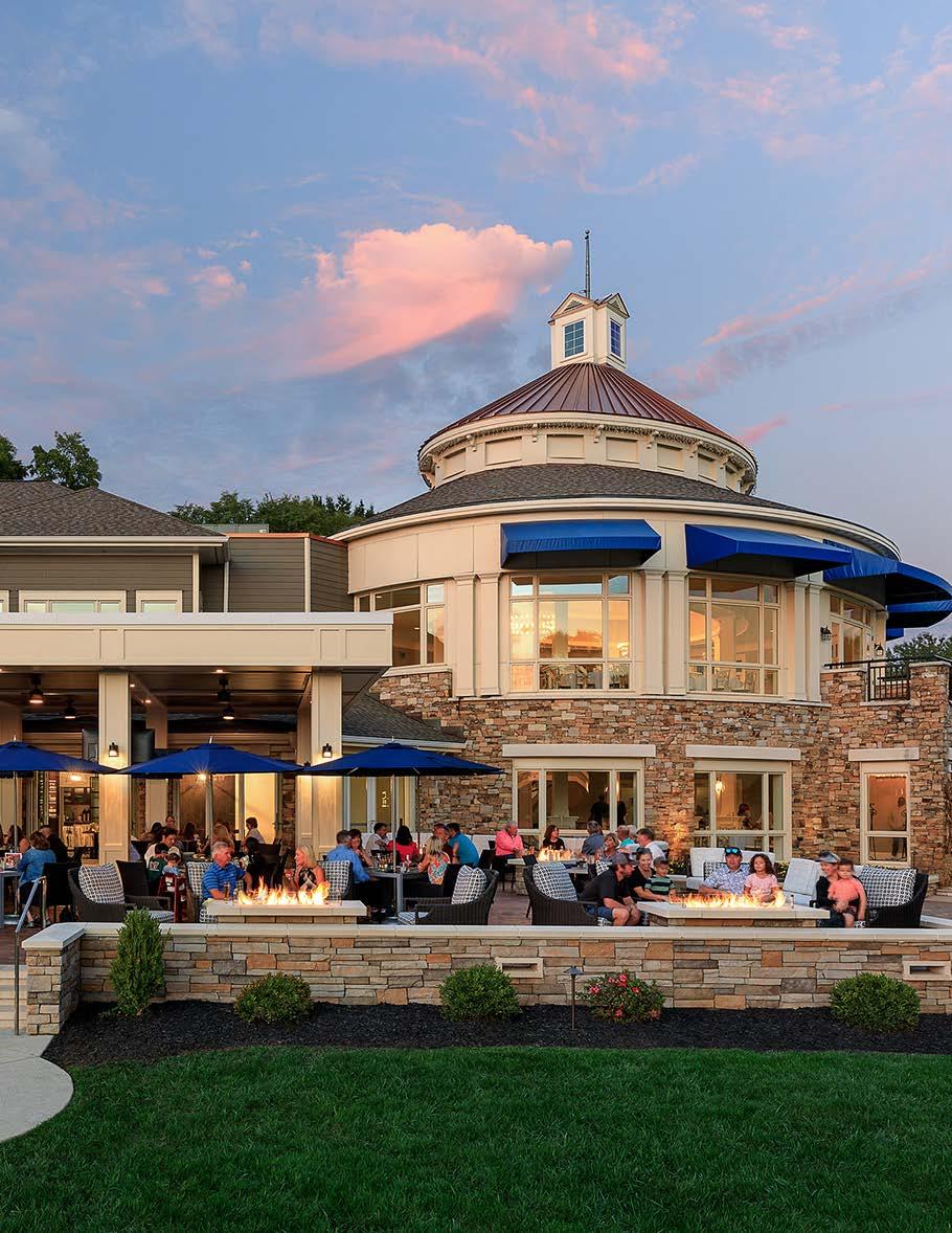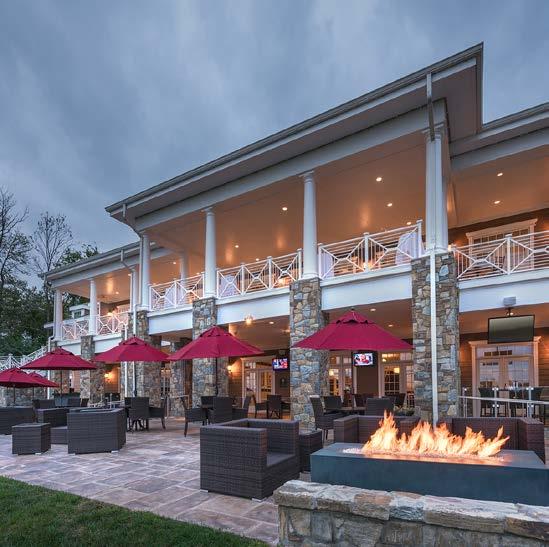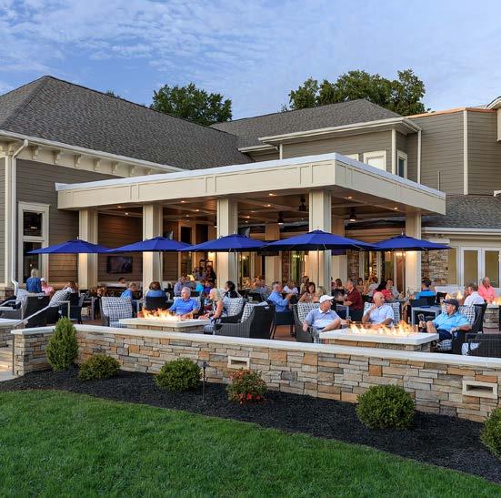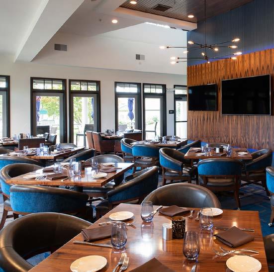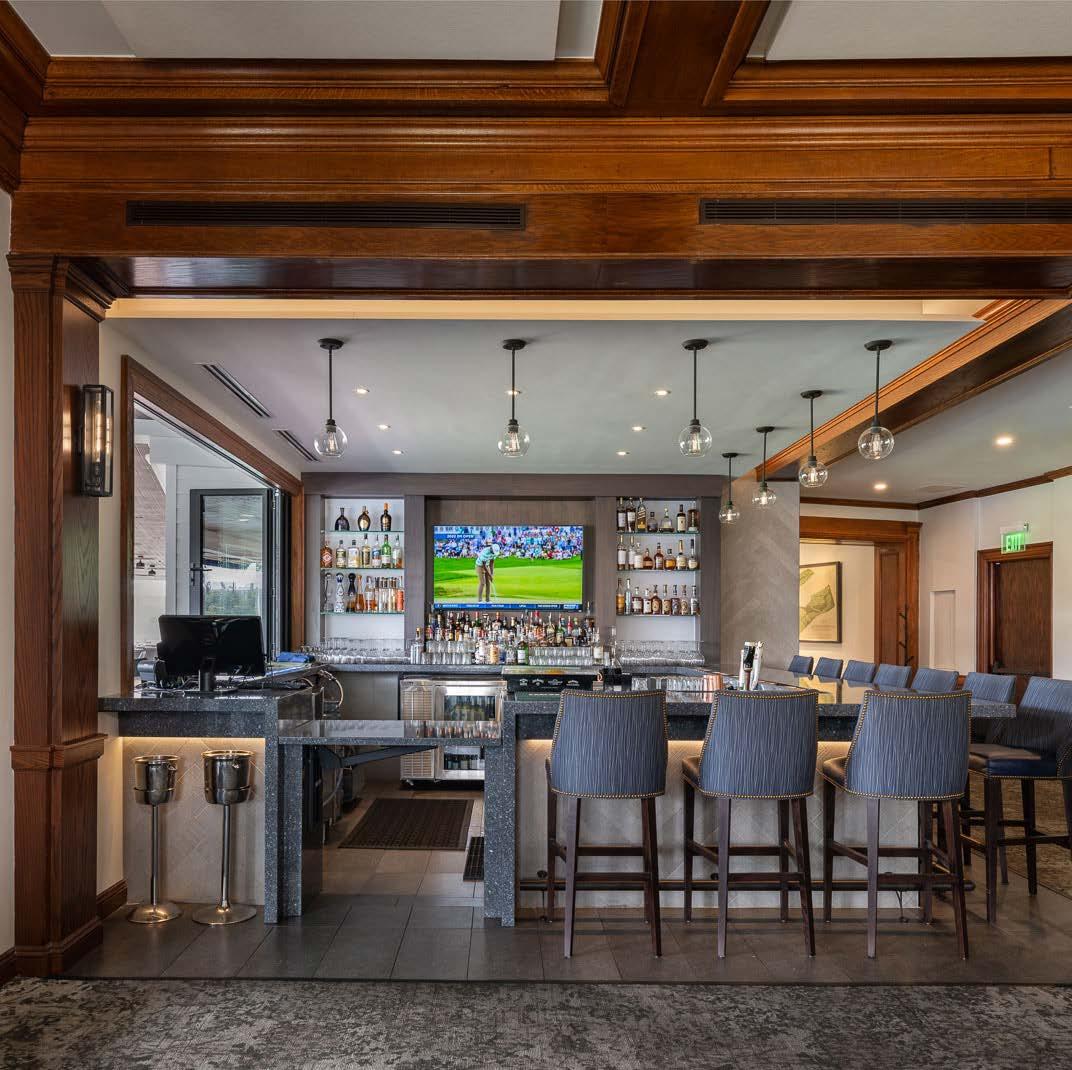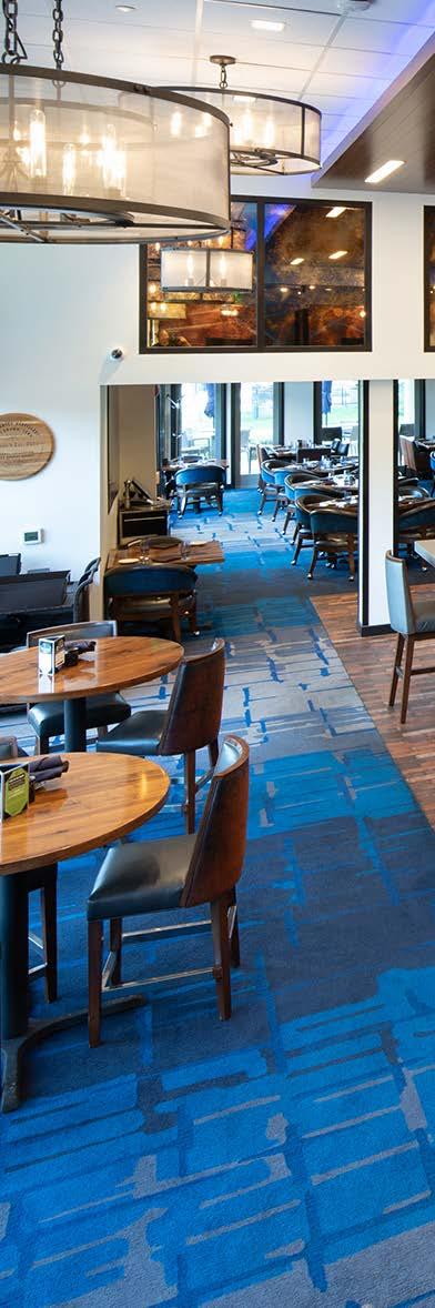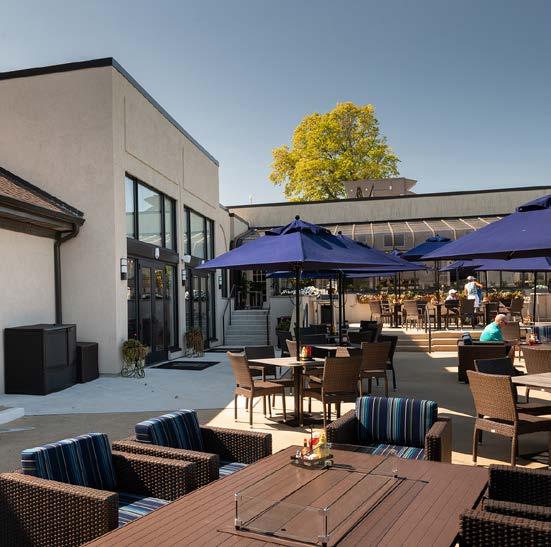 The main dining room was transformed into a bright and vibrant space with nostalgic wall graphics and fullheight booths. Double-hung windows were replaced with a folding window wall to further open the space and bring light into the room. Former offices were removed to create a new private dining room with full-wall wine displays and a faux wood beam ceiling. The restrooms were completely rebuilt to be fully accessible, with new finishes that complement the design. A major highlight of the renovation is the new multi-level outdoor stone patio and covered dining areas comprising multiple fire pits, ceiling fans, and casual seating. A low wall surrounding the patio is covered in cultured stone to perfectly match the exterior stone walls of the club—making a seamless expansion of the outdoor amenities.