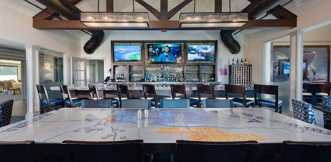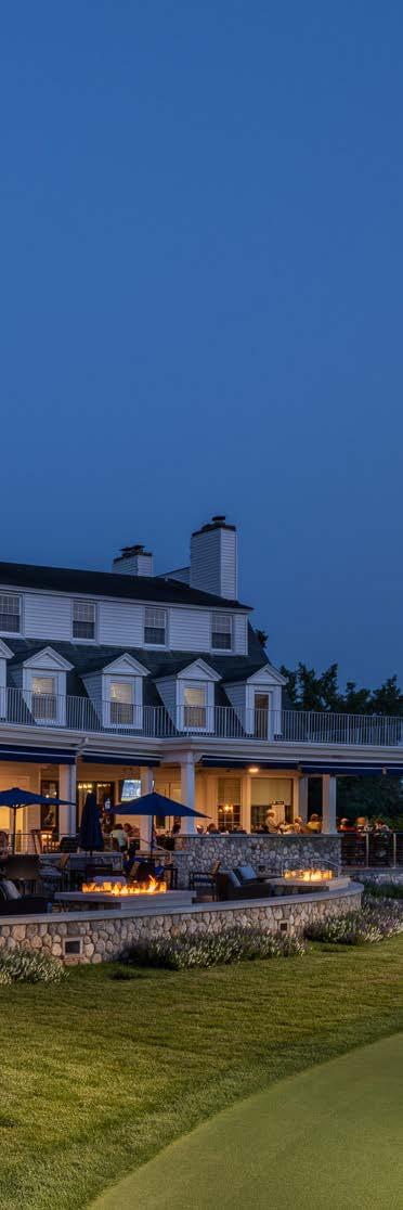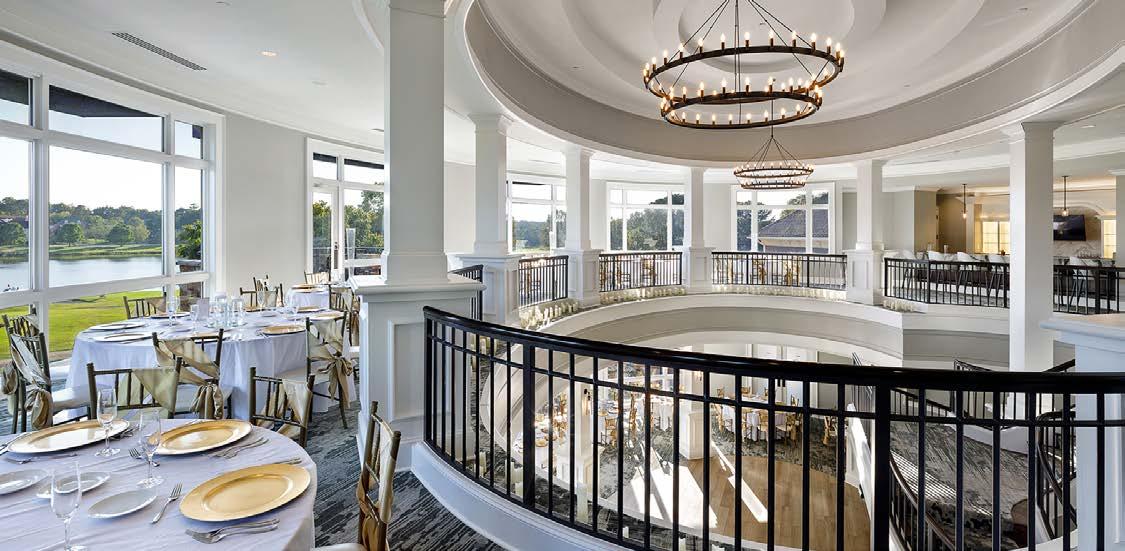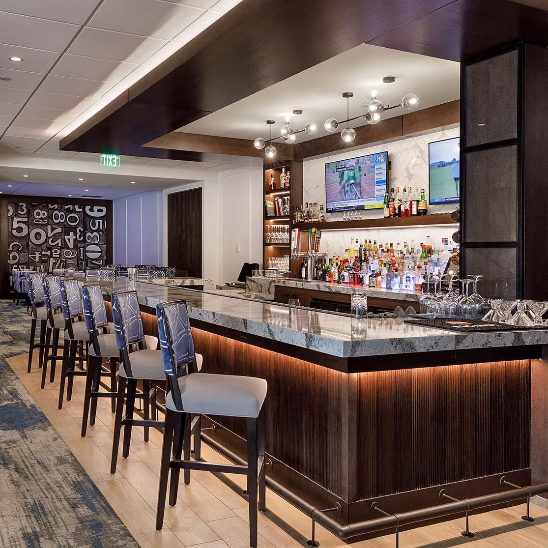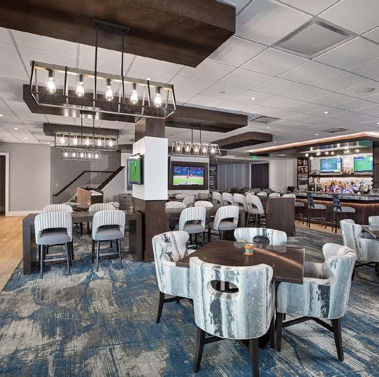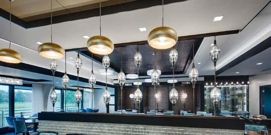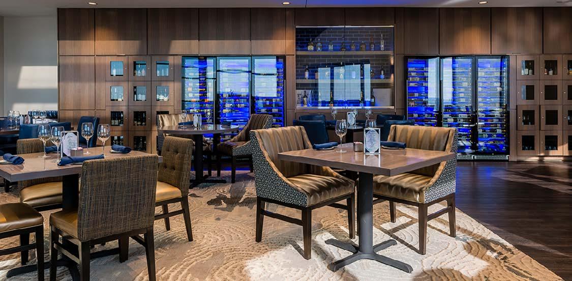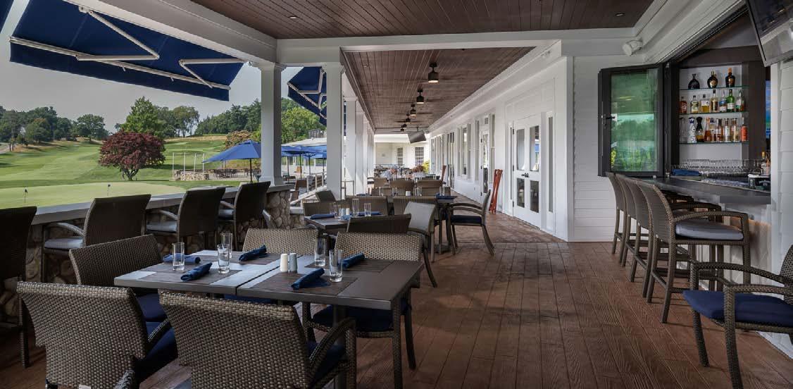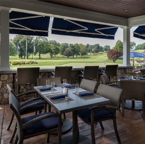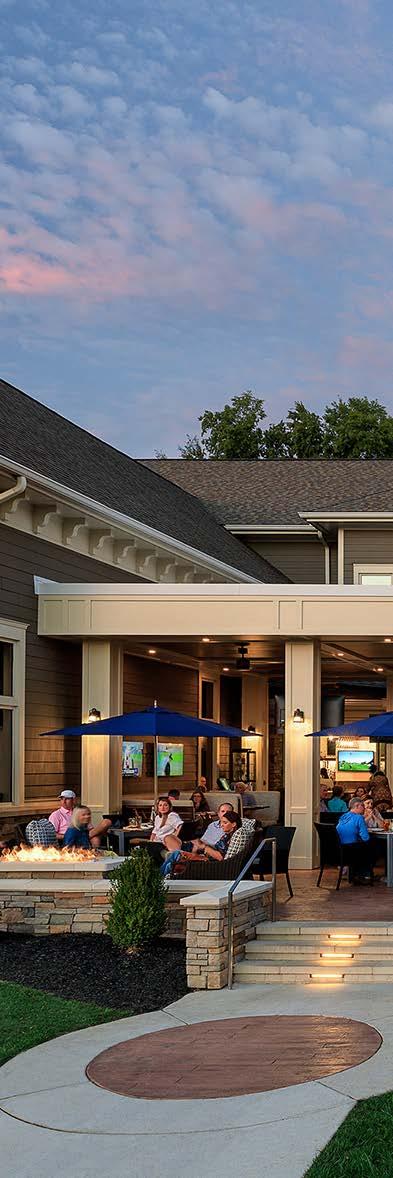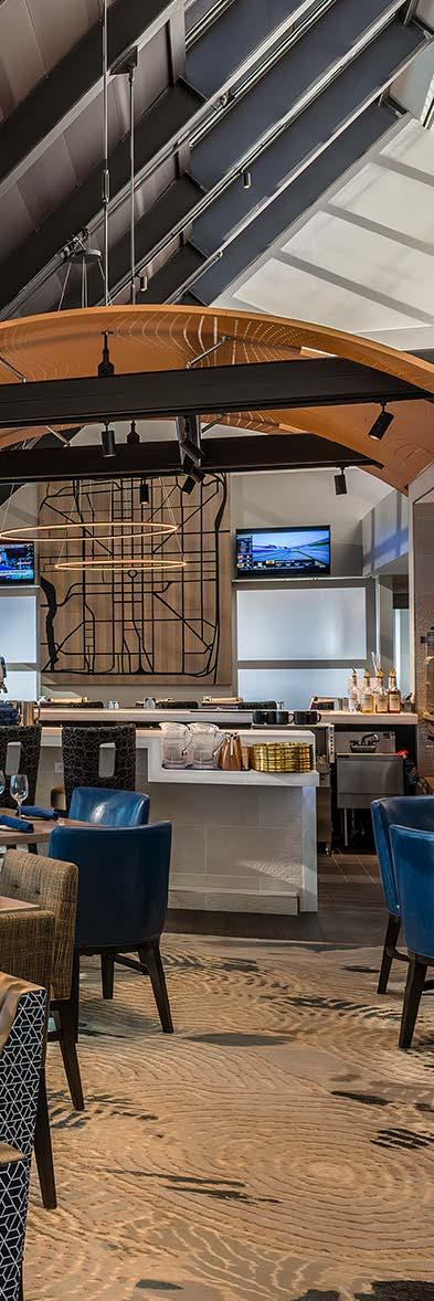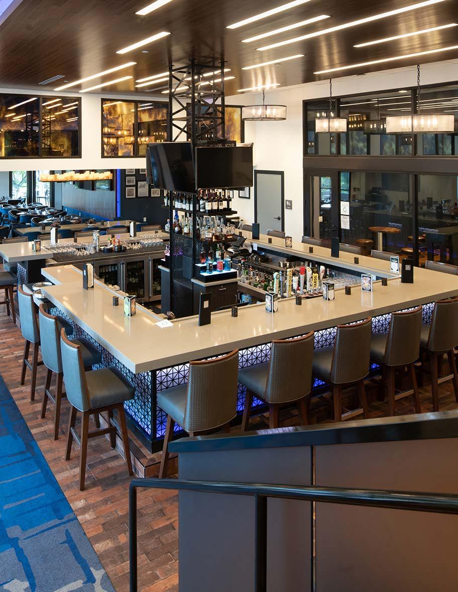 The main dining room was transformed into a bright and vibrant space with nostalgic wall graphics and fullheight booths. Double-hung windows were replaced with a folding window wall to further open the space and bring light into the room. Former offices were removed to create a new private dining room with full-wall wine displays and a faux wood beam ceiling. The restrooms were completely rebuilt to be fully accessible, with new finishes that complement the design. A major highlight of the renovation is the new multi-level outdoor stone patio and covered dining areas comprising multiple fire pits, ceiling fans, and casual seating. A low wall surrounding the patio is covered in cultured stone to perfectly match the exterior stone walls of the club—making a seamless expansion of the outdoor amenities.