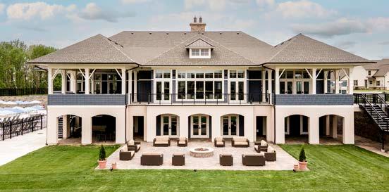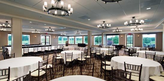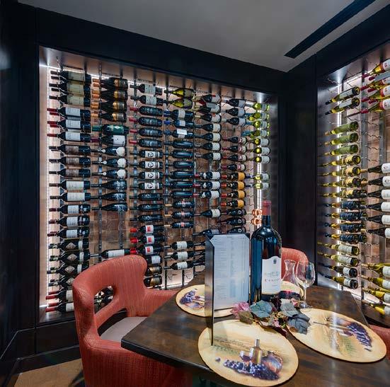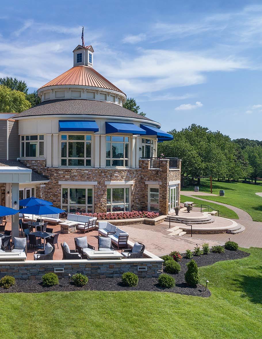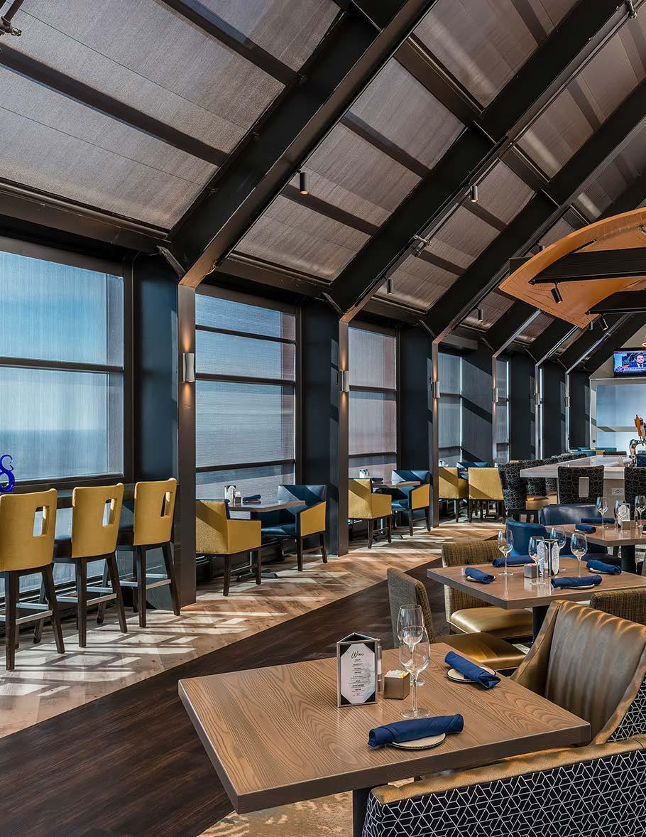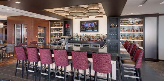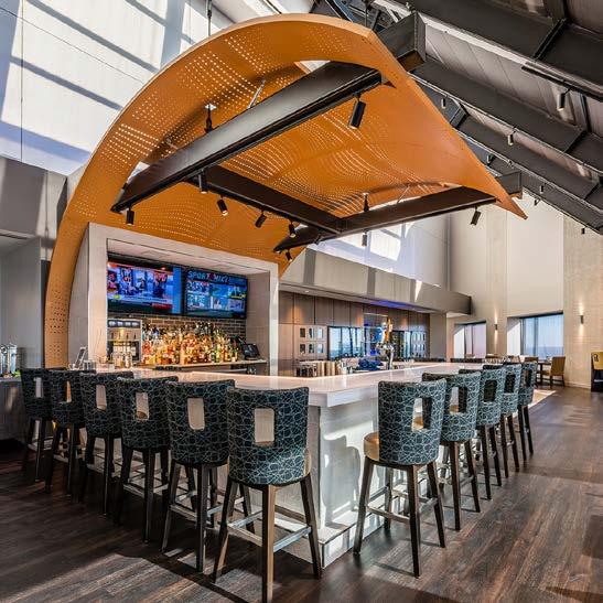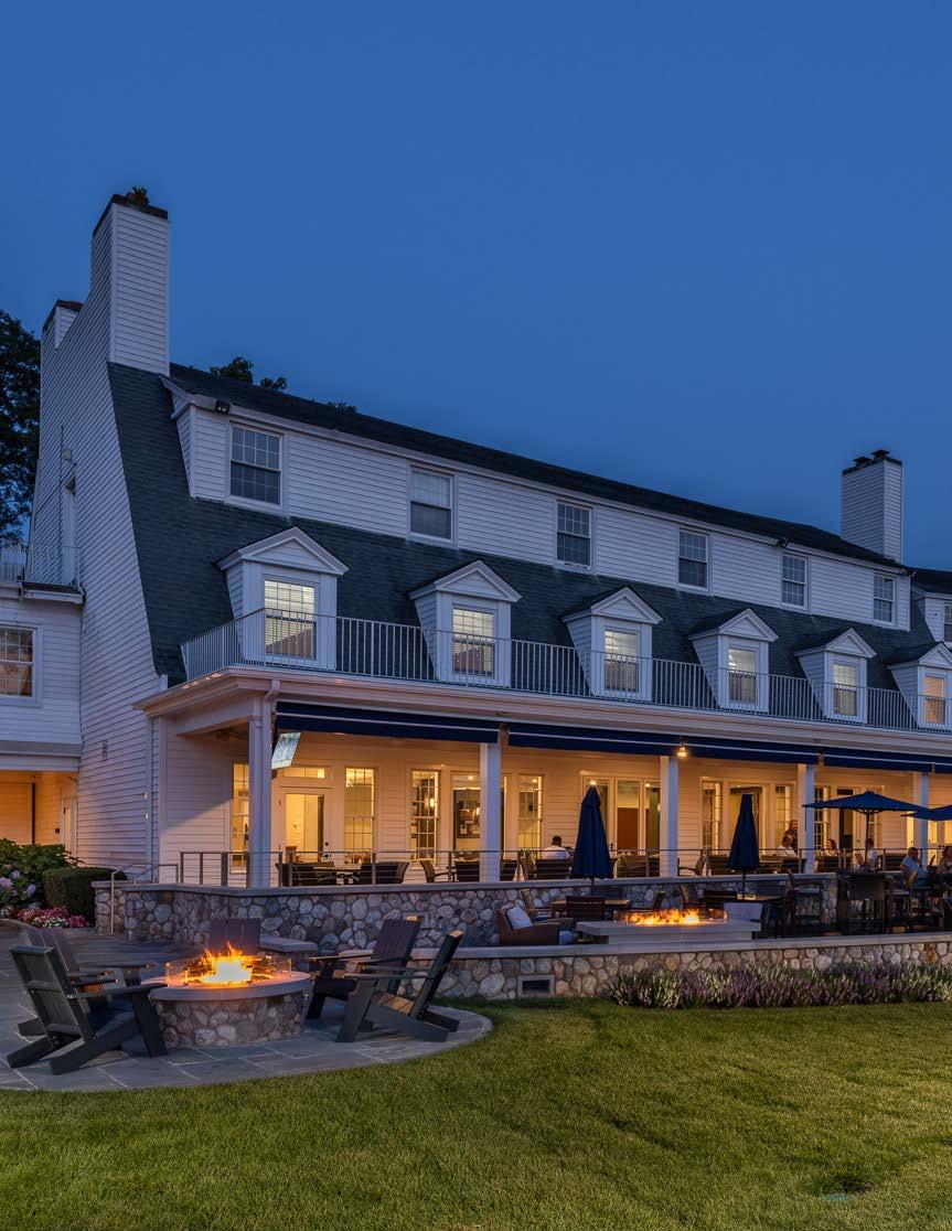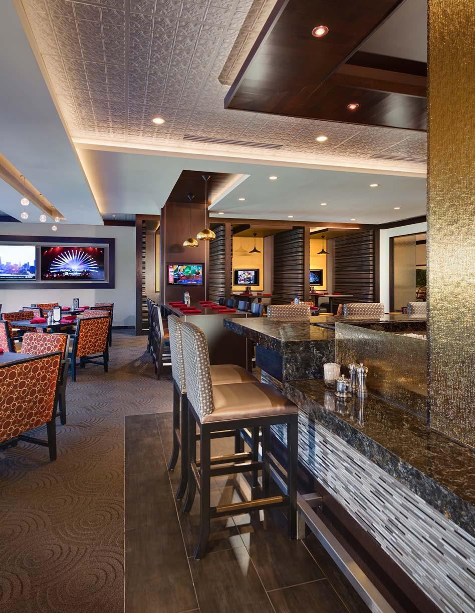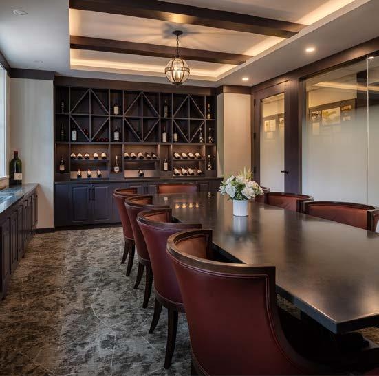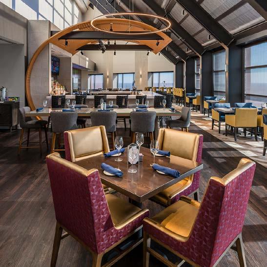 The main dining room was transformed into a bright and vibrant space with nostalgic wall graphics and fullheight booths. Double-hung windows were replaced with a folding window wall to further open the space and bring light into the room. Former offices were removed to create a new private dining room with full-wall wine displays and a faux wood beam ceiling. The restrooms were completely rebuilt to be fully accessible, with new finishes that complement the design. A major highlight of the renovation is the new multi-level outdoor stone patio and covered dining areas comprising multiple fire pits, ceiling fans, and casual seating. A low wall surrounding the patio is covered in cultured stone to perfectly match the exterior stone walls of the club—making a seamless expansion of the outdoor amenities.