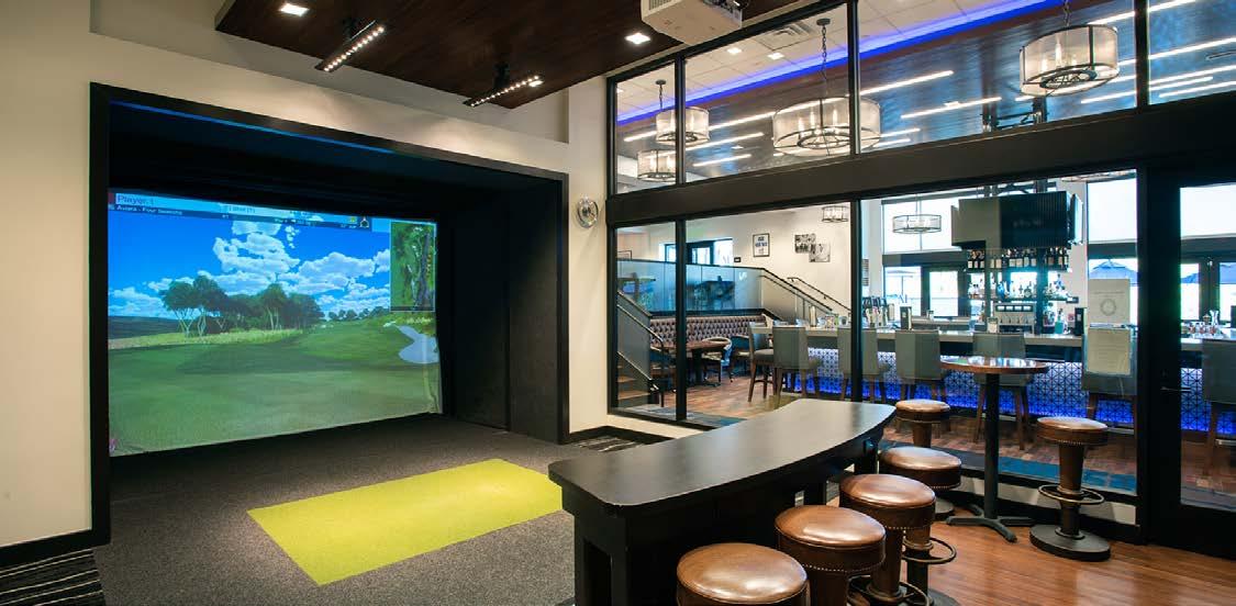 In response to the difference in elevation of the three existing components, the addition is sunken from the main clubhouse but takes advantage of the high ceilings created by the offset. The golf simulator room is open to the interior with a glass partition that mirrors new expansive windows overlooking the expanded and updated patio. In addition to the dining space, the kitchen was renovated, and locker rooms and private event spaces were refreshed totaling 5,800 sf of new and renovated space.