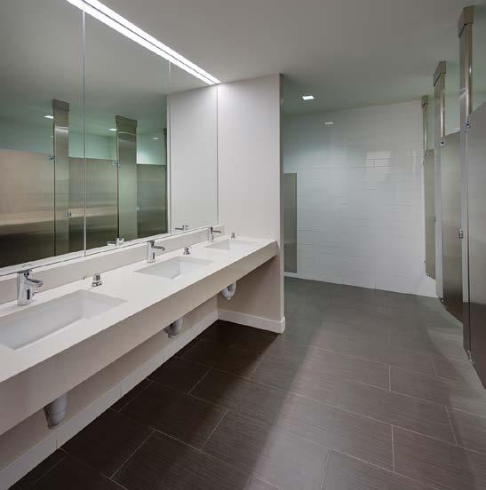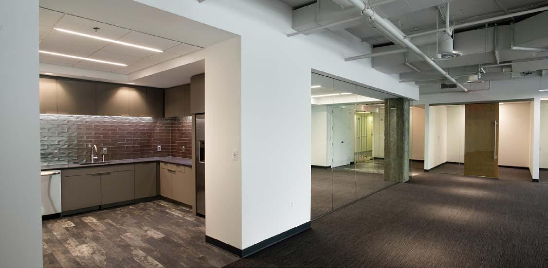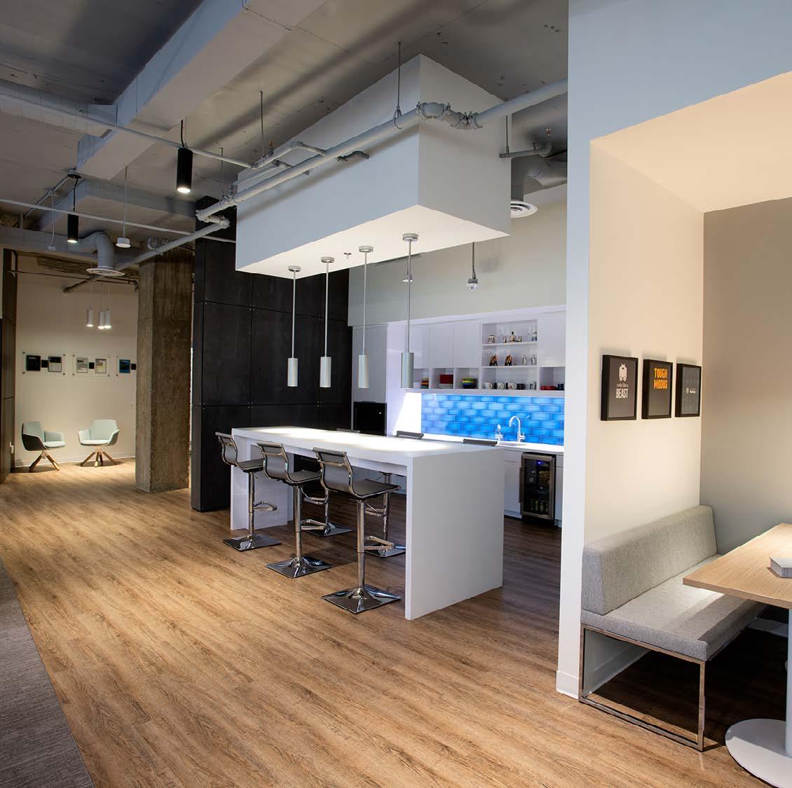 To enrich the tenant experience, owners often include a fitness center with lockers and showers, communal co-working zones and flexible shared conferencing, and outdoor amenities on the roof. Within the tenant suite, amenities similar to a high-end residential environment could include shared work areas that feature a wine bar, beer taps, grab-and-go food options, and access to media.