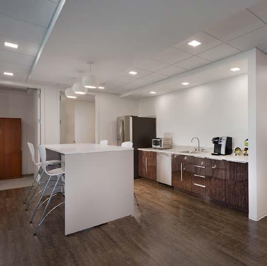After a site reconfiguration eliminated natural daylight on the concourse level of the primary building on a commercial campus, management turned to Architecture, Inc. for a creative solution to utilize the unoccupied space. The area that was formerly an office suite was transformed into a 4,320 sf building-wide amenity through the creation of conference center and tenant lounge. In the conference room, a retractable room divider can separate the large space into two smaller rooms. The remaining lounge is a single large space with multiple uses, delineated by floor and ceiling finishes. The centerpiece is a wood-slatted ceiling installation with integrated lighting that centers on a large pantry and counter seating area opposite a large flat screen television.