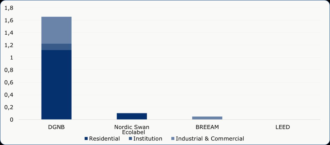 The figure shows that almost 1,66 million completed m2 were DGNB certified in 2024 Of this, the majority was certification of residential buildings at approximately 1,1 million m2 . The relatively large coverage by DGNB across the certification market especially owes to the fact the DGNB offers certifications across all 3 major building types (residential, commercial & industrial and institutions) and has significant market penetration in each of these building types. The Nordic Swan Ecolabel was the second most used certification scheme in 2024, covering 0,1 million m2 - and particularly in residential buildings, and to smaller extent industry and institutions. BREEAM and LEED, cover a smaller share of total buildings constructed in 2024. BREEAM certification was obtained for industrial buildings, whereas no LEED certification is observed for new builds in 2024.
