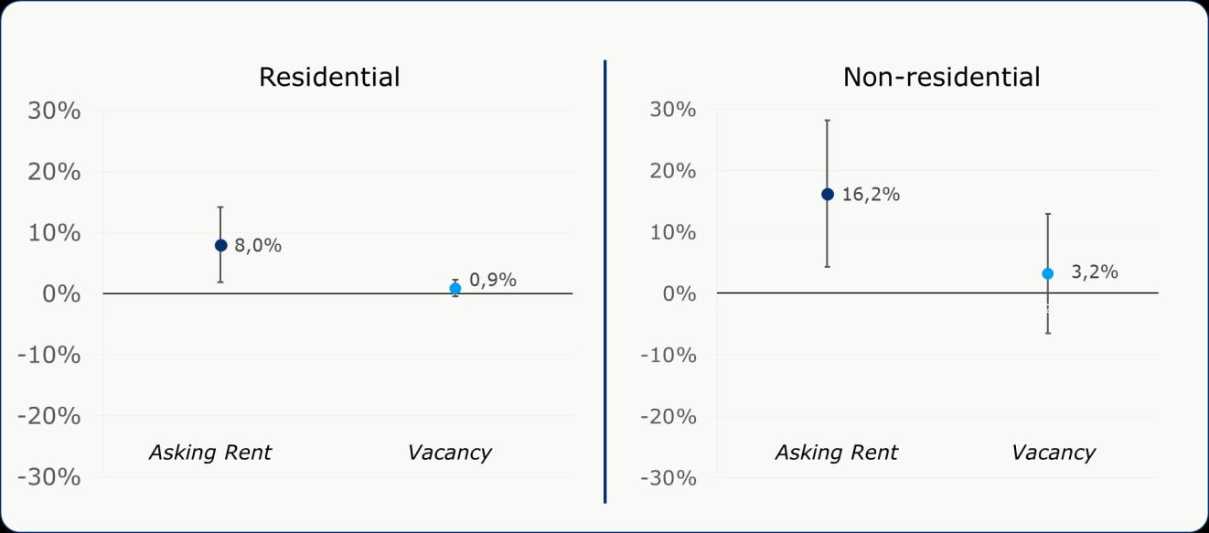 7 Effective rent is calculated as the asking rent adjusted for vacancy. Vacancy is recorded only once per quarter, meaning we know whether a building was vacant on the first day of each quarter. To measure vacancy over a full year, we take the share of quarters during which a unit was vacant between Q4 2024 and Q3 2025. This approach provides an approximate measure of vacancy, as a unit is considered vacant for an entire quarter even if it was only vacant at the start of that quarter.