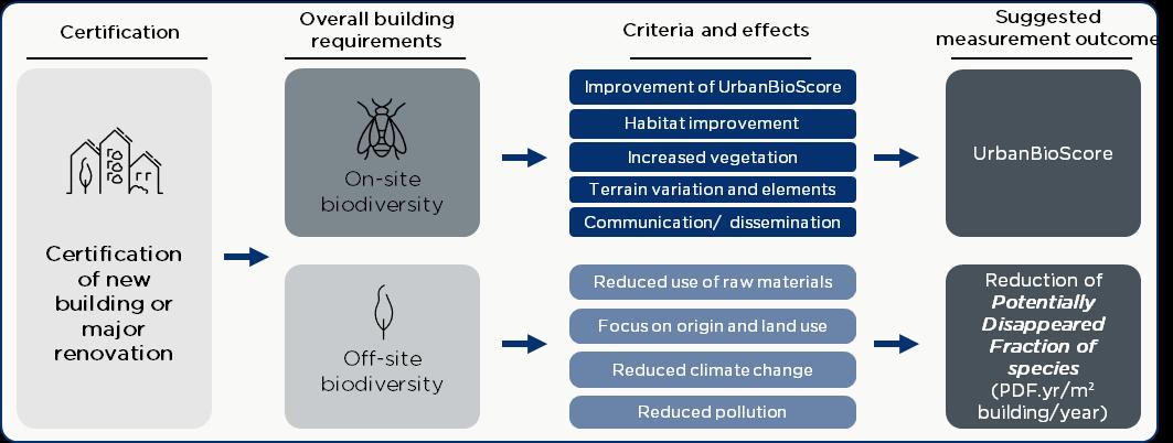 Certification schemes today primarily address off-site biodiversity indirectly, for example through requirements for certified wood, responsible sourcing, recycled or re-used materials. This indirect focus reflects a general lack of consistent and comparable metrics and data.