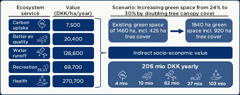Increasing green space from 24% to 30% yields an estimated annual socio-economic value of DKK 206 million, distributed across the five ecosystem services. Stormwater retention and health benefits represent the largest components, reflecting the portfolio’s heavy urban footprint and the well-documented link between green space and improved public health.