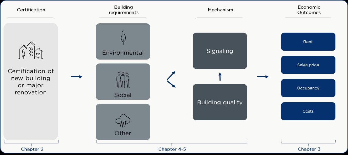 The rightmost boxes in Figure 1 present the primary outcomes examined in this report. Our main focus is the economic value of certification to owners and investors - most notably the rent premiums and property value effects analysed in Chapter 3. These observed market outcomes represent the collective value of all underlying building requirements - environmental as well as social - as they are capitalised into investor and owner returns – through the quality and signalling pathway Chapters 4 and 5 then step back from these economic outcomes to explore why such value emerges. Here, we examine how certification goes beyond ordinary building regulations, and how these additional requirements may translate into the market premiums documented in Chapter 3.
