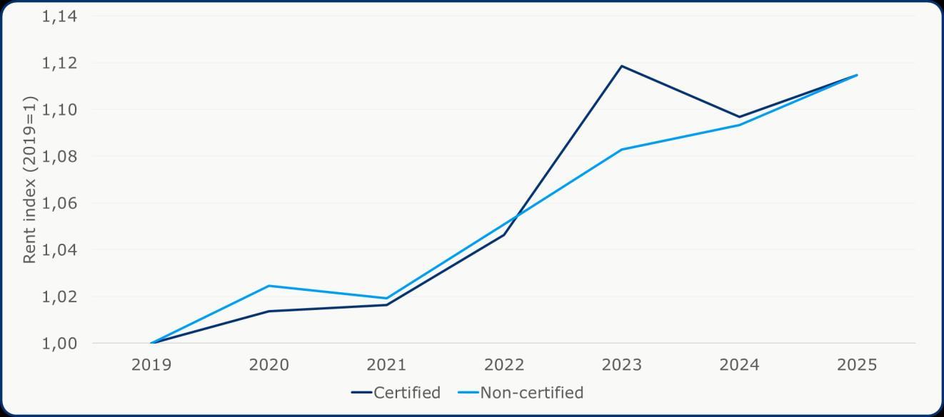 For building owners, investors and developers, a central question is whether certification generates economic value. Certification requires both time and financial resources, ranging from direct certification and consultancy fees to potential indirect costs such as alternative material choices or additional documentation. For certification to represent a viable business case, these costs must be offset by measurable economic benefits. Some such tangible economic benefits could be observed in differential rental levels, vacancy or transaction prices for certified buildings – indicators we assess in this chapter Certification may also generate non-monetary advantages, for example a reduced carbon footprint, healthier materials, more efficient processes or branding value (see also chapters 4-5). Most investors will, however, typically seek evidence of a direct financial effect. The first objective of this chapter is, therefore, to examine whether certified buildings exhibit observable monetary benefits, focusing particularly on rental outcomes. Transaction premiums are addressed in section 3.3, where data constraints on certified buildings with recorded transactions currently limit robust quantification