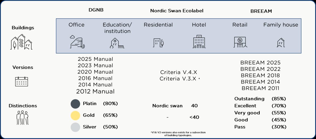 The certification schemes studied in this report are all voluntary schemes developed to measure and steer construction in the built environment towards more sustainable solutions. We delimit ourselves to study certification schemes for new construction or major renovations1. The building types in scope range from residential to commercial and institution buildings, with primary focus on residential and office buildings. In Denmark, the most prominent certification providers include DGNB, the Nordic Swan Ecolabel, BREEAM and to a lesser extent LEED, as shown in chapter 2. These schemes are operated independently, and as