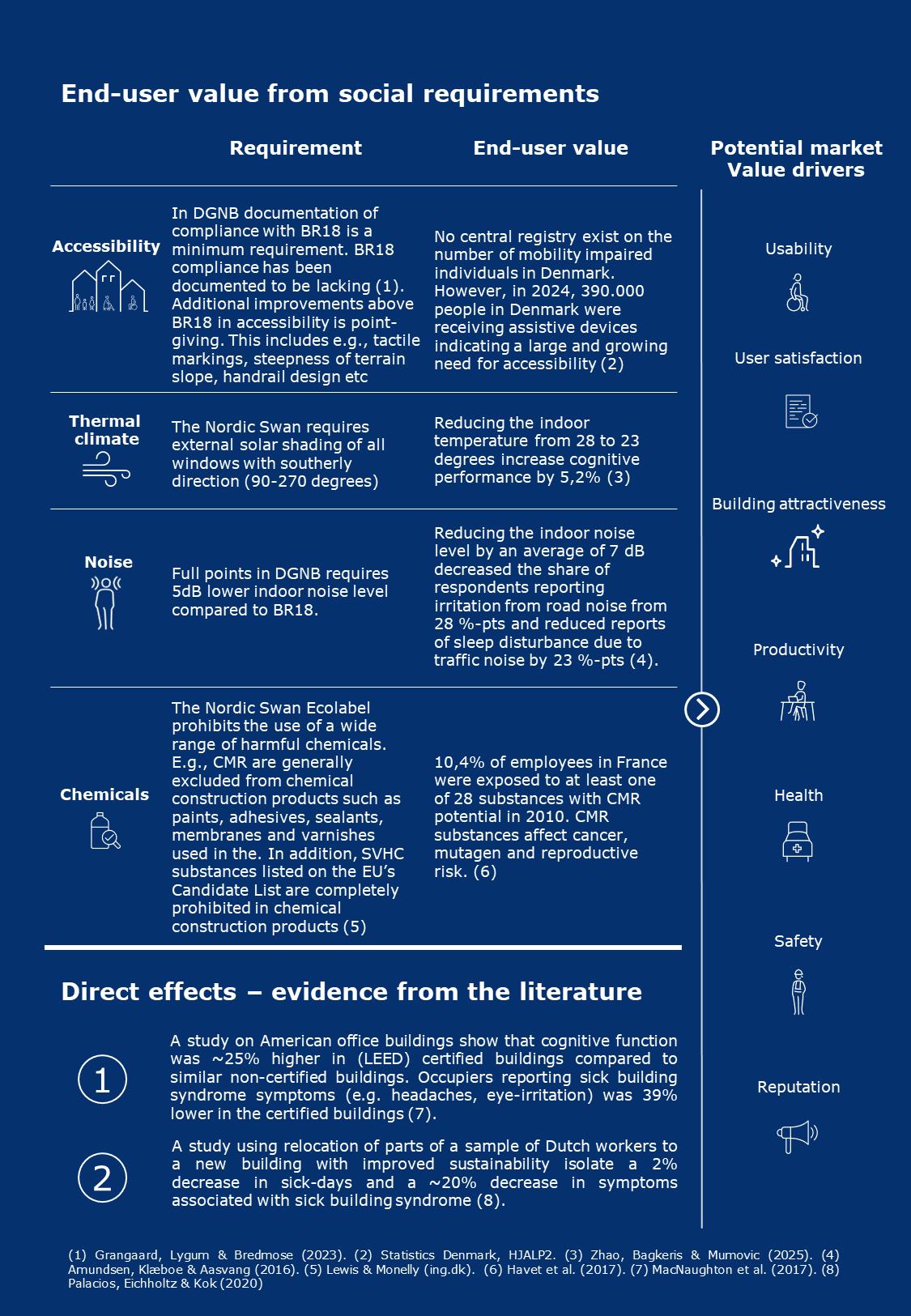 Because social outcomes are context-dependent and difficult to isolate causally, we do not attempt an exhaustive account. Rather, we illustrate selected examples of end-user benefits that are supported by evidence and linked to specific DGNB or Nordic Swan requirements. These examples highlight areas where certification goes beyond BR18 standards, and where improvements in indoor air quality, thermal comfort, acoustics or accessibility can be expected to enhance user well-being and, ultimately, perceived building value.