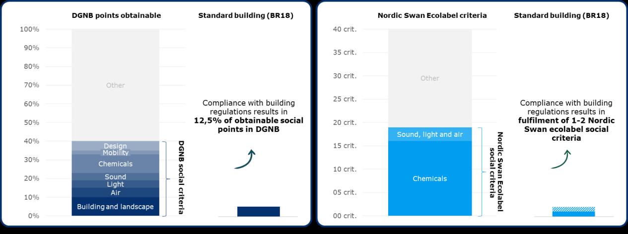 Similar to figure 4.2 and 4.3, the figure below illustrates how DGNB and Nordic Swan Ecolabel set stricter requirements within the social dimensions compared to those mandated by Building Regulations (BR18). By comparing how a BR18-compliant building would score under the two schemes, the graph highlights the additional performance demanded by certification beyond regulatory compliance. Again, this comparison is not straightforward, as BR18 is not designed to be directly mapped onto certification schemes. The comparison should therefore be understood as an illustrative exercise