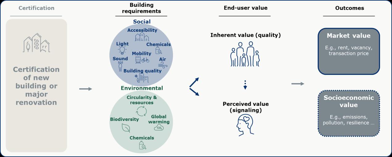 The previous section showed that the social dimension is a major component of certification schemes, and many of their requirements exceed what a BR18-compliant building would normally provide. It is debatable whether BR18 compliance should be considered the baseline level for non-certified buildings. In Denmark, documentation and assessment of social outcomes under building regulations are generally not required or centrally reviewed, besides occasional sampling. Certification schemes address this gap by incorporating third-party validation to ensure that requirements are met – and incentivize further improvements above this Since baseline compliance is not fixed, we still use BR18 as a useful baseline comparison, acknowledging that this could produce conservative estimates of the value generated33 A natural next step is therefore to assess the effects of this additionality. Measuring such effects involves two stages. First, the additional requirements must generate tangible or perceived benefits for end users - for example, improved comfort, health or well-being Second, these end-user effects must translate into perceived or realized market value, typically through users’ willingness to pay (WTP) for these enhanced attributes.