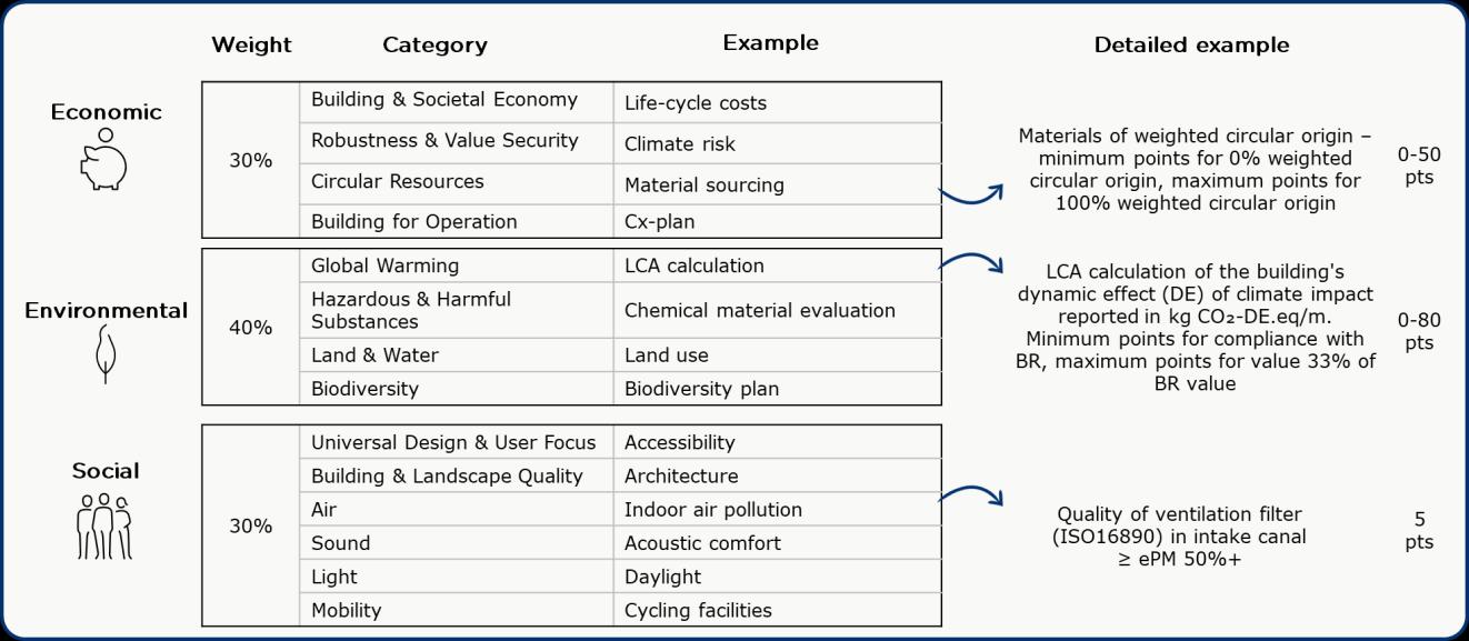 In Denmark, the building Regulations (Bygningsreglementet, BR) sets out the minimum requirements for buildings. Compliance with these regulations is therefore a fundamental requirement for any construction project, although documentation of compliance is not always necessary. However, as expectations for sustainability, quality, and accountability continue to rise, voluntary certification schemes have taken on a growing role in the construction sector – both in advancing requirements and documenting compliance. When building owners choose to certify a project, they commit to meeting additional standards that go beyond what the building Regulations require – and in many cases also to document compliance with regulations, that is not otherwise formally checked. While the schemes vary in focus and scope, they typically introduce supplementary requirements that cover the economic, environmental, and social aspects of a building’s design, construction, and operation. Four certification schemes are especially relevant in Denmark. This includes DGNB, Nordic Swan Ecolabel, BREEAM and to a lesser extent LEED. To obtain certification from these providers, building owners are required to document adherence to the requirements of the certification scheme as stipulated in comprehensive manuals outlining technical requirements. Figure 2.1 exemplifies some such requirements for the DGNB scheme, to give an idea of the contents of certification