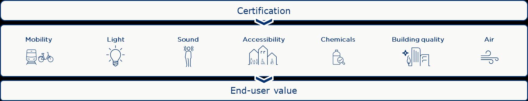 • Additionality of certification: An important aspect of the value generated by certification runs through the way buildings affect the people who use them. We show that certification not only ensures validation with building regulation requirements within areas such as light, sound, chemicals, air and mobility – but also sets additional requirements above these. Some of these requirements may drive both market and socioeconomic value.