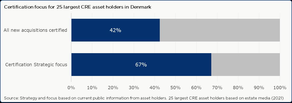 • Transaction prices: Plausiblepathwaystotransactionpremiaincludehigheroperatingincomedrivenbye.g., tenant demand, lower costs and regulatory/operational resilience, and preferential financing/investor appetite. However, data constraints on certified buildings with recorded transactions currently limit robust quantificationinDenmark.Still,weshowalargeinvestorfocusoncertificationinbuildingportfolios.