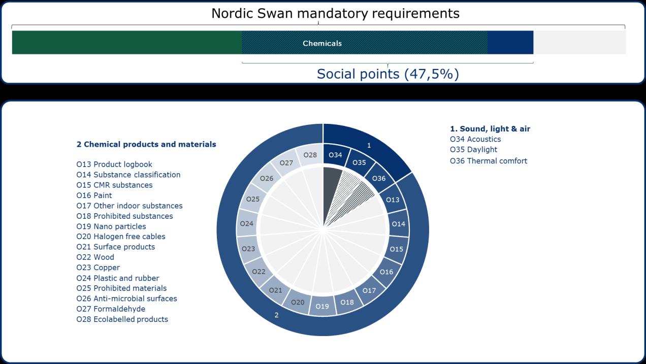 Within our definition of social outcomes for the end-users of buildings, we once again visualize the relative importance of this dimension within DGNB and Nordic Swan Ecolabel. For DGNB specifically, 40% of total obtainable points are related to the social dimension as illustrated in figure 5.1. while 19 out of 40 mandatory requirements for Nordic Swan Ecolabel are within this dimension. It should be noted that the category “chemicals” are the same for both the environmental and social dimension and included in both sections, since chemicals have both a distinct social (e.g. health) and environmental (e.g. pollution) side.