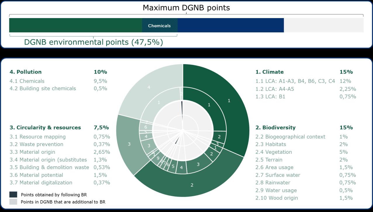 Note: DGNB 2025 for residential buildings compared to BR18 (2025). A BR18 compliant building would obtain points in the specific criteria for surface water criteria and building site chemicals. Source: own construction See DGNB manual (2025) for specific requirements.