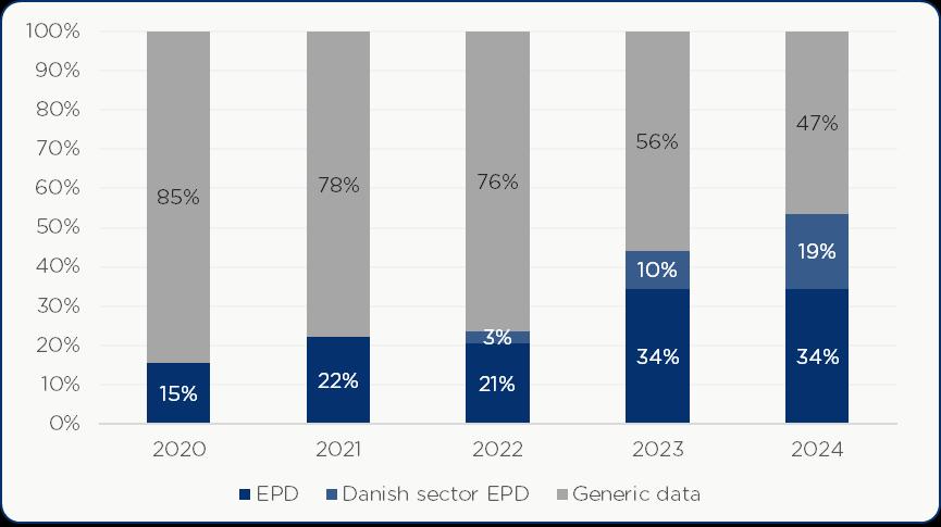 Statistics Denmark does not track the use of certification across the constructed building mass However, commercial data platforms gather project information across a large range of actors in the professional building market (residential and non-residential) While such platforms do not cover the full range of buildings constructed in Denmark, they offer insights into a sizeable part of the market. Figure 2.4 shows the prevalence of different certification types for all projects completed in 2024 listed in such a commercial database The database covers projects corresponding to roughly 55% of the total newly constructed floor area registered by Statistics Denmark (Figure 2.3) and should therefore be interpreted as a substantial but not complete view of the market4