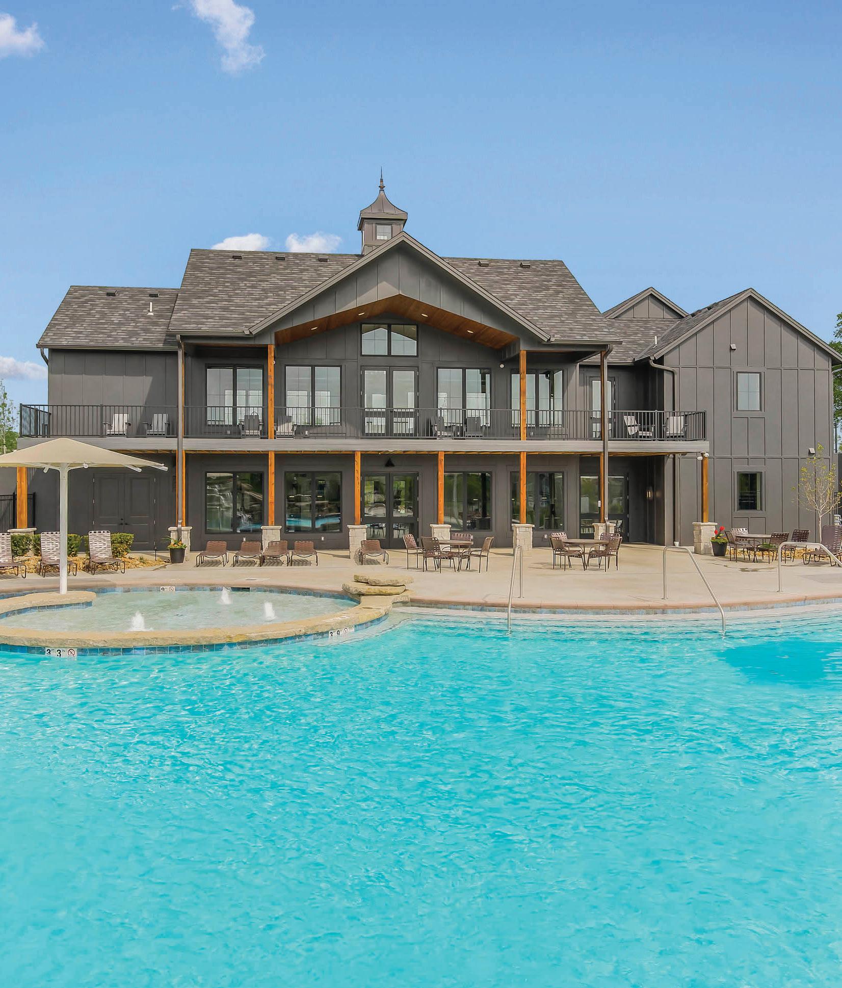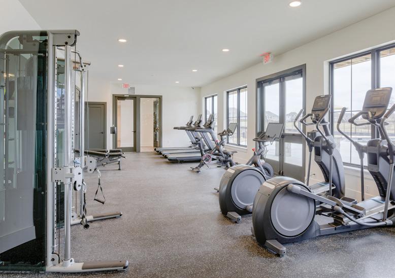 The crown jewel in its list of extraordinary amenities is a multimillion-dollar clubhouse. The main floor feels like a fine hotel lobby, complete with a marble-topped wet bar and 585-square-foot deck overlooking the resort-style pool below. The lower-level, 716-squarefoot fitness area is outfitted with treadmills, Peloton bikes, elliptical machines, weights, and more.