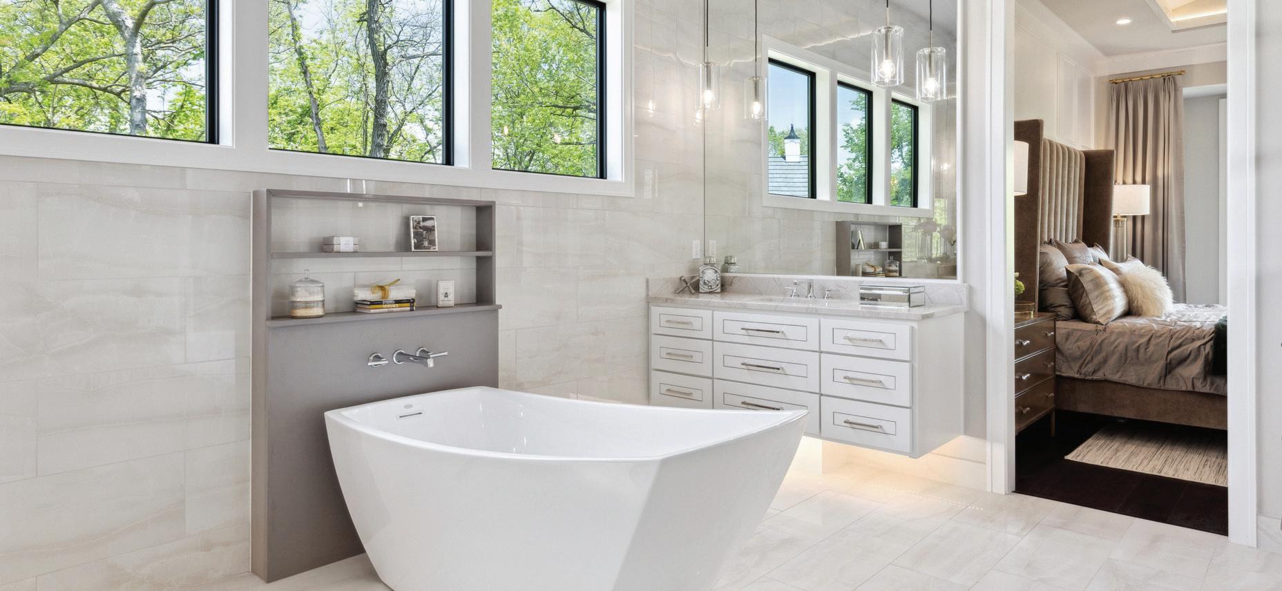 The main floor primary suite highlights a wall of windows, custom built-ins, stylish en-suite bathroom, large walk-in closet, and private laundry.