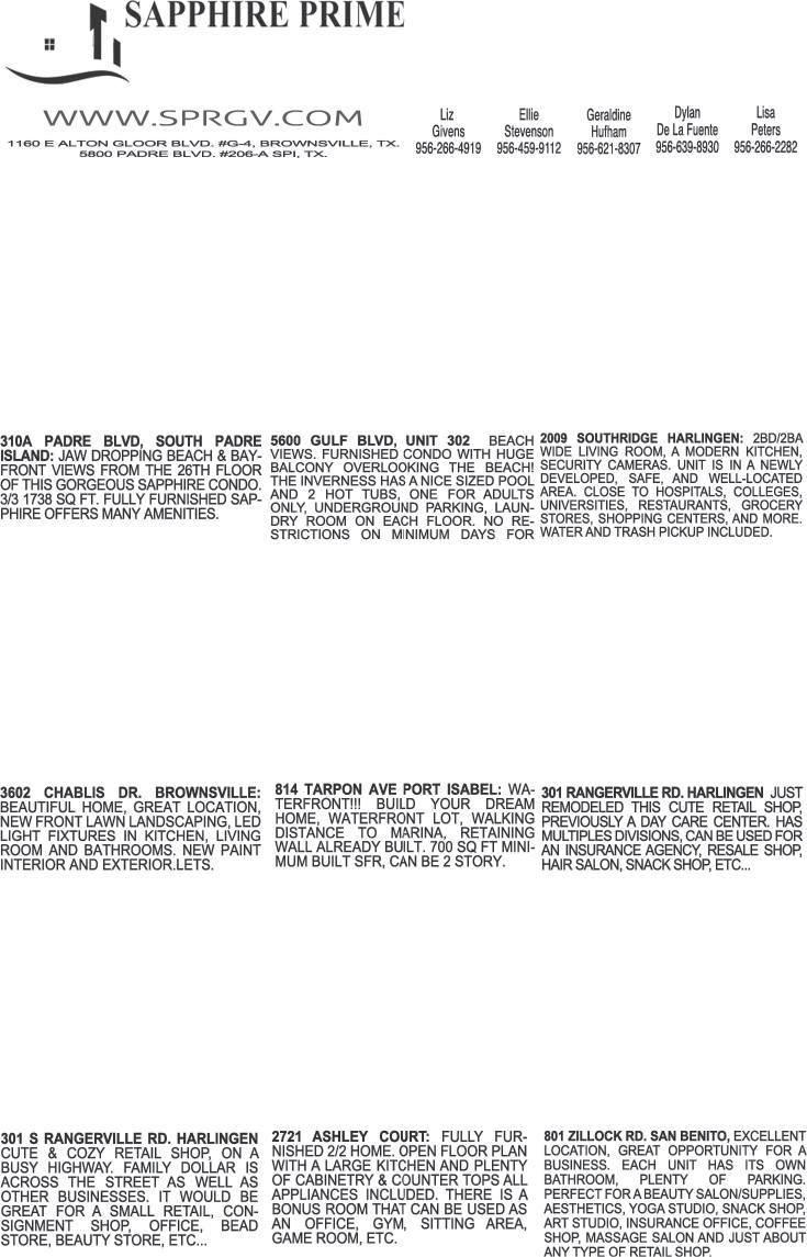 CALL MUNDO (956) 299-0507 30+ Years Selling SPI & Surrounding Areas SAPPHIRE UNITS FOR SALE #201.....2/2.....$689,500 #403.....2/2.....$715,900 #401.....3/3.....$845,000 • 3 Lots E Polaris & Padre $895,000 • 2 Lots W Polaris & Padre $565,000 • 2 Lots W Cora Lee & Padre $495,000 2100 PADRE BLVD - $1,475,000.00 ALL THREE PROPERTIES FOR SALE FOR ONE PRICE. 102 E Pompano 2112 Padre Blvd COMMERCIAL LOTS NEW LISTING Sunchase IV #514 2 bedroom, 3 bath furnished unit. Two level with outstanding water views. WWW.CAMERONCOUNTYSOURCE.COM • PAGE 30