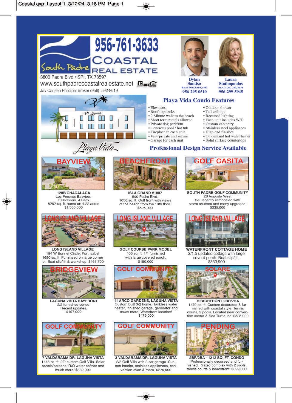 WWW.CAMERONCOUNTYSOURCE.COM • PAGE 31 ALLC UNDOM (956) 299-0507 30+ earsY Selling SPI & Surrounding Areas SAPPHIRE UNITS FOR SALE #201.....2/2.....$689,500 #403.....2/2.....$715,900 #401.....3/3.....$845,000 • 3 Lots E Polaris & Padre $895,000 • 2 Lots W Polaris & Padre $565,000 • 2 Lots W Cora Lee & Padre $495,000 102 E Pompano 12 Padre Blvd CIALRCOMME TSOL NEW LISTING Sunchase IV #514 2 bedroom, 3 bath furnished unit.