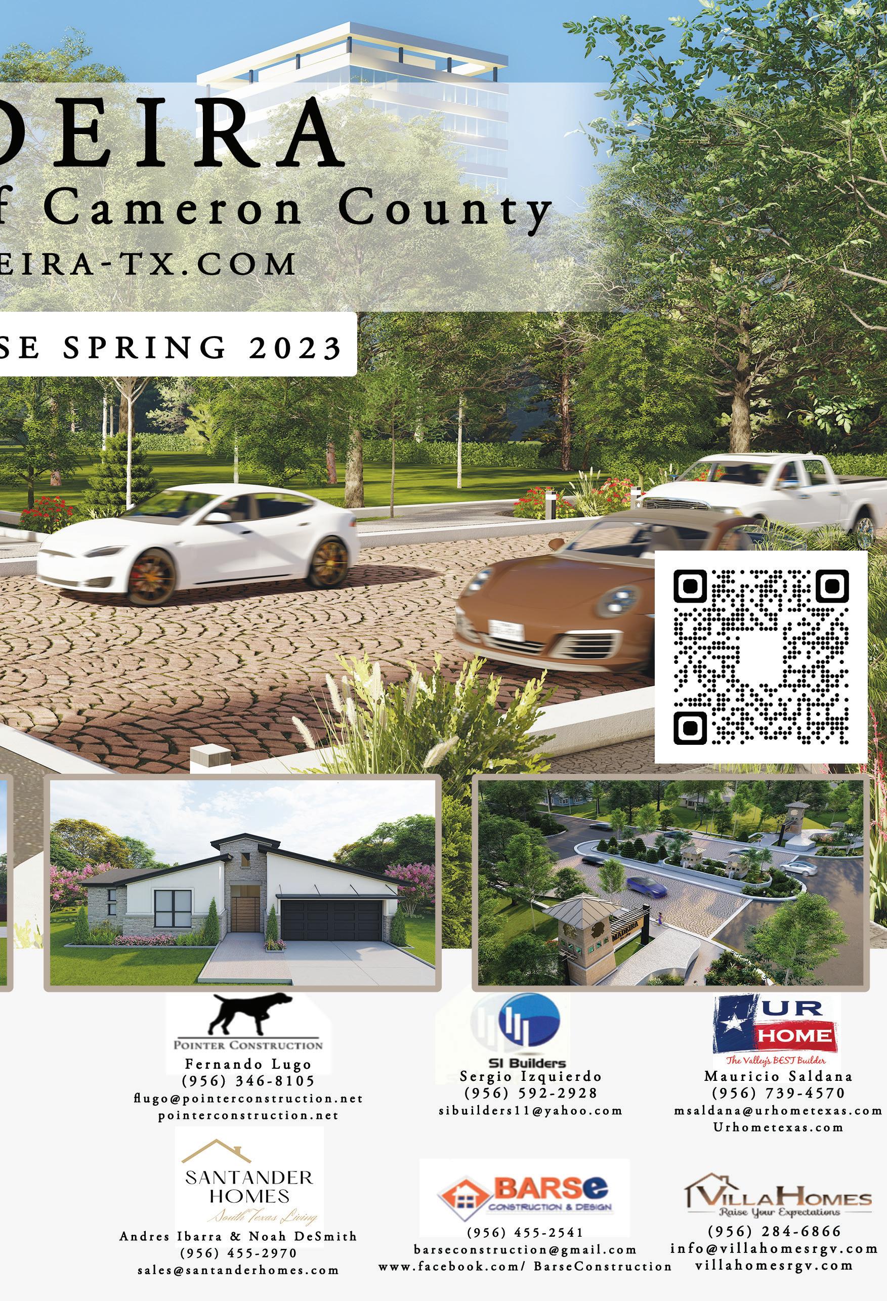 (956) 433-5648 103 S. Garcia St Port Isabel, TX 78578 Norma Hinojosa, Broker Christobal Cisneros (956) 459-0298 Adrian Bolado (956) 466-8174 Alycen Lacombe (956) 433-8564 Alexa Ayar (956) 250-9454 Claudia Hernandez (956) 243-5649 Andrew Infante (956) 832-9853 Roberto Rodriguez (956) 545-2205 Tyra Greene (956) 566-4355 Maggie Bolado (956) 466-8412 Elite homesspi.com Will Zuniga (956) 336-9462 Maurine Salas (956) 431-8700 Mark Wiese (956) 525-2143 Norma Turkington (956) 459-3839 Cindy Machac (956) 451-4844 Gayle Hood (956) 459-9536 Michelle Miller (956) 407-7112 Leo Longoria (956) 463-7833 Hector Rodriguez (956) 466-7305 Vanessa Alaniz (512) 573-2010 Jared Schmidt (956) 909-3000 Raul Aguilar (956) 701-0623 Hoisen Moore (956) 465-9356 Stacey Ricco (956) 266-3551 Jules Wilk (956) 343-1218 Cynthia Rocha (956) 203-9206 Laurie Howell (956) 371-8875 WWW.CAMERONCOUNTYSOURCE.COM • PAGE 12