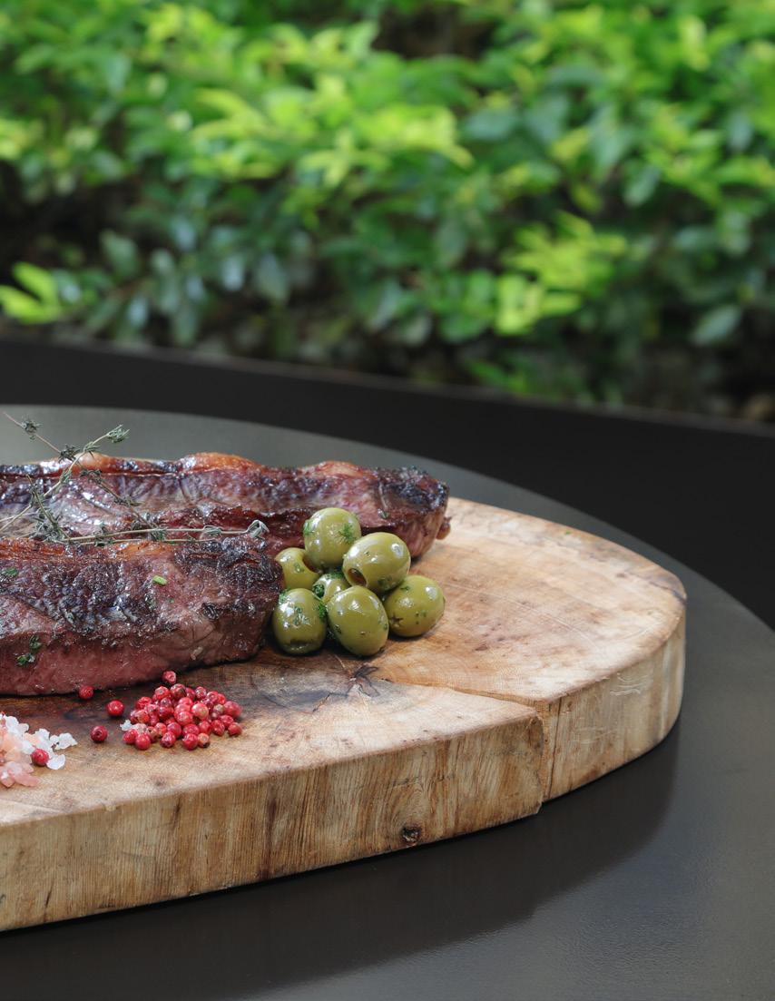 Acompañado de tomates asados, mozzarella fresca, parmesano, puré de papas con albahaca y aceite de oliva.