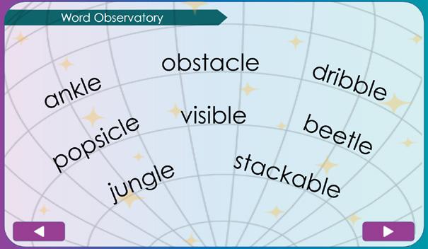 SAY “Take a moment to carefully observe these words: ankle, obstacle, dribble, popsicle, visible, beetle, jungle, and stackable. Look for things that all or a few of the words have in common.”