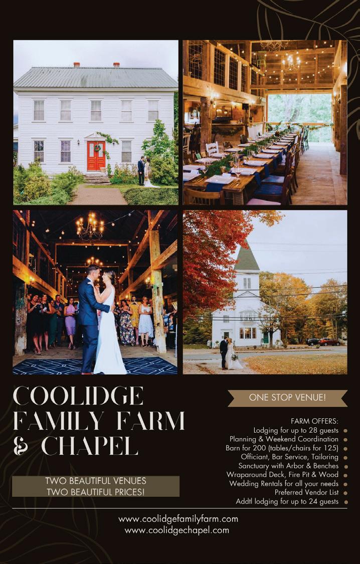 Barn • Farm House • Chapel. A beautiful colonial style farmhouse with attached barn located on eleven acres of retired farmland. Services include notary, day of coordination, insured bar service, and wedding rentals and props to make your day truly unique at an affordable price. 207-671-7479 • www.coolidgefamilyfarm.com