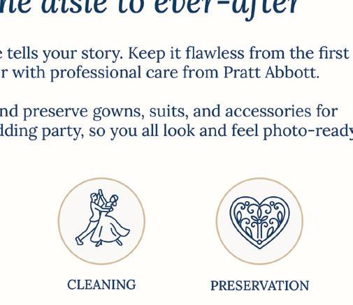 Pratt Abbott is Maine’s only local expert in wedding dress care. Unlike other vendors, we do all work in-house and never send your garments out of state. Services include: pre-wedding preparation (so you look perfect walking down the aisle), post-wedding cleaning (to remove soil and protect delicate fabrics), wedding dress preservation (to retain the beauty and value of your dress for generations). Choose Pratt Abbott for personal service, expert garment care, and outstanding results. 14 locations in Maine to serve you. 207-210-5127 • www.prattabbottwedding.com