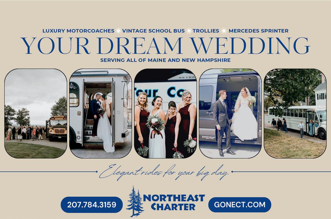 We know that when you’re planning your big day, transportation is a key element to everything coming together. Our team is here to give you the solutions you need to ensure that everything goes smoothly. It’s important to us that your special day is glitch-free. 207-784-3159 • www.northeastchartertour.com