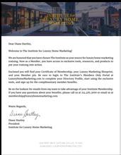 BE THE LOCAL LUXURY EXPERT Looking to grow your sphere of influence with the affluent in your area? Learn how to position yourself as a market expert, attract affluent leads, and grow your referral business through The Institute's Luxury Home Marketing training. THE INSTITUTE FOR LUXURY HOME MARKETING Diane Hartley, President and has earned the Certified Luxury Home Marketing Specialist™ designation for superior performance, achieved GUILD™ recognition for sales at or above one million dollars, and is a Member of The Institute for Luxury Home Marketing through completed the Luxury Home Marketing training on certifies that December 31, 2020 December 1, 2020 Diane Hartley LuxuryHomeMarketing.com/training