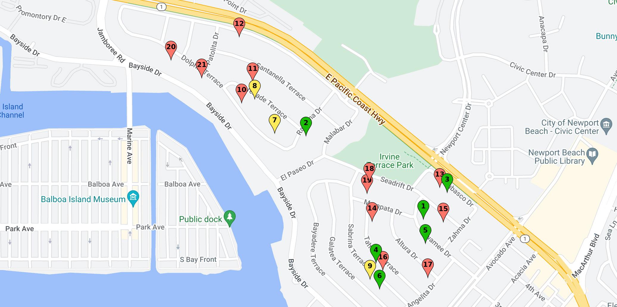 NO. ADDRESS BEDS TOTAL BATHS DOM EST. SQ. FT.* LOT SIZE SQ. FT. PRICE PER SQ. FT. SELLING PRICE** 10 1416 Dolphin Terrace 3 2 3 1,500 7,802 $2,286 $3,495,000 11 1424 Serenade Terrace 3 3 70 2,900 7,590 $1,378 $3,995,000 12 1319 Bonnie Doone Terrace 4 4 132 2,800 7,245 $1,470 $4,050,000 13 1915 Chubasco Drive 4 5 72 4,400 10,536 $1,056 $4,600,000 14 1810 Tahuna Terrace 4 5 63 4,300 11,798 $1,310 $5,679,000 15 2007 Seadrift Drive 5 7 0 3,700 11,210 $1,587 $5,856,000 16 1921 Tahuna Terrace 3 2 0 2,700 9,760 $2,282 $6,200,000 17 2027 Altura Drive 4 3 45 3,700 9,384 $1,910 $6,995,000 18 1809 Seadrift Drive 4 5 172 5,800 10,580 $1,440 $8,350,000 19 1806 Marapata Drive 4 6 0 5,600 10,551 $1,541 $8,700,000 20 1201 Dolphin Terrace 5 8 47 N/A 12,780 N/A $19,130,000 21 1301 Dolphin Terrace 5 9 143 11,000 15,840 $1,771 $19,500,000 A visual representation of the data on the right. Sold Active Pending © GOOGLE 2022 If you would like your home featured in this publication and mailed to the Irvine Terrace neighborhood, please call me today at 949.887.9871. www.HomesInIrvineTerrace.com