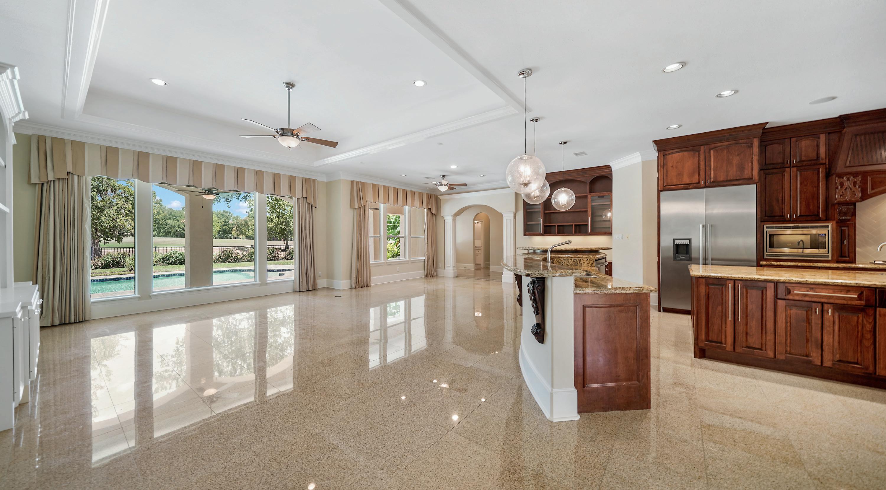 Formal living room boasts high ceilings, a fireplace, and custom drapery which frame the windows that have the most picturesque views of the backyard pool and golf course.