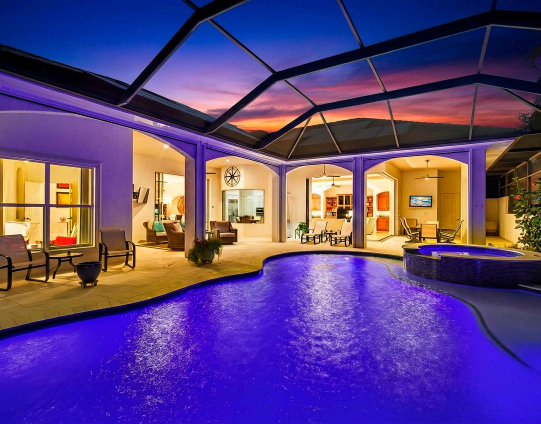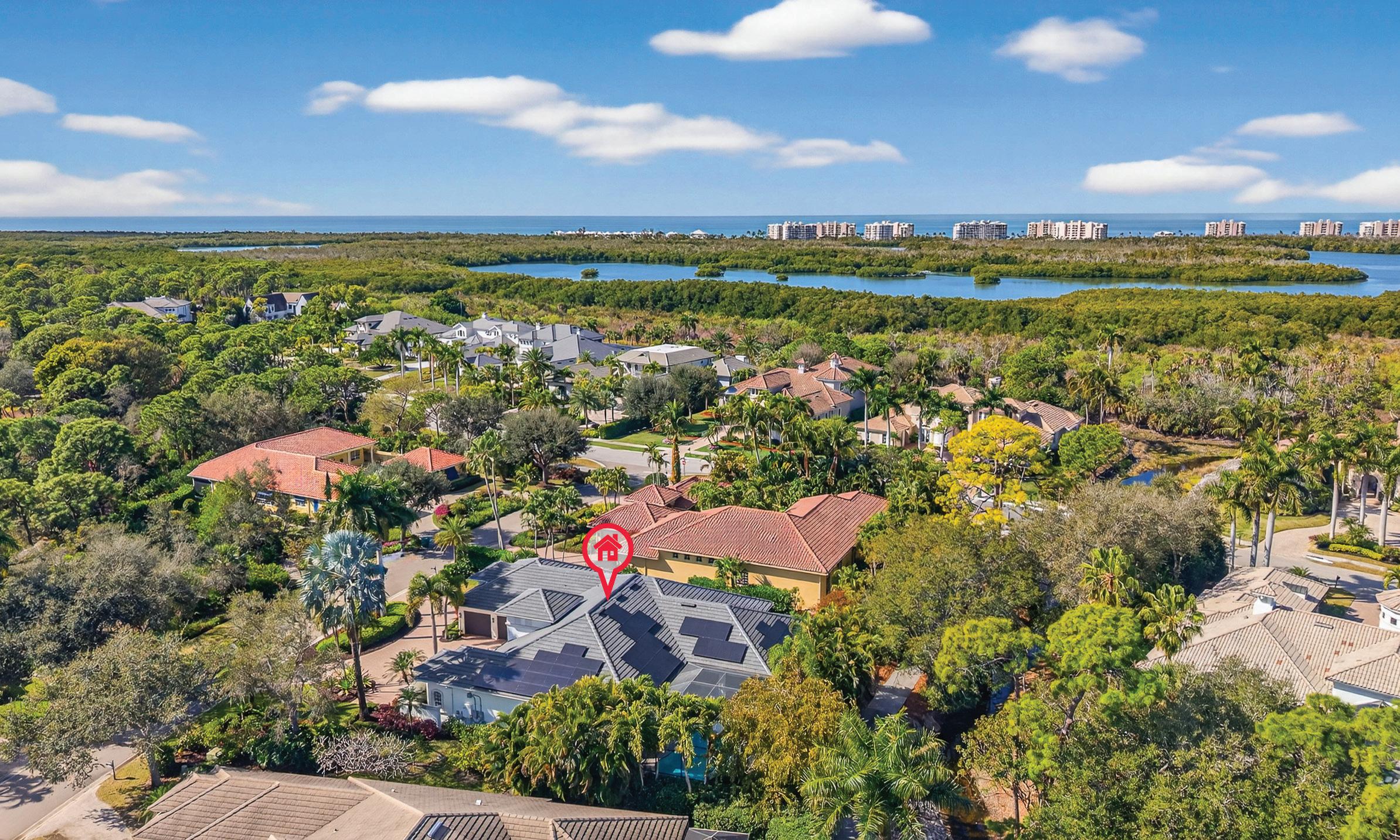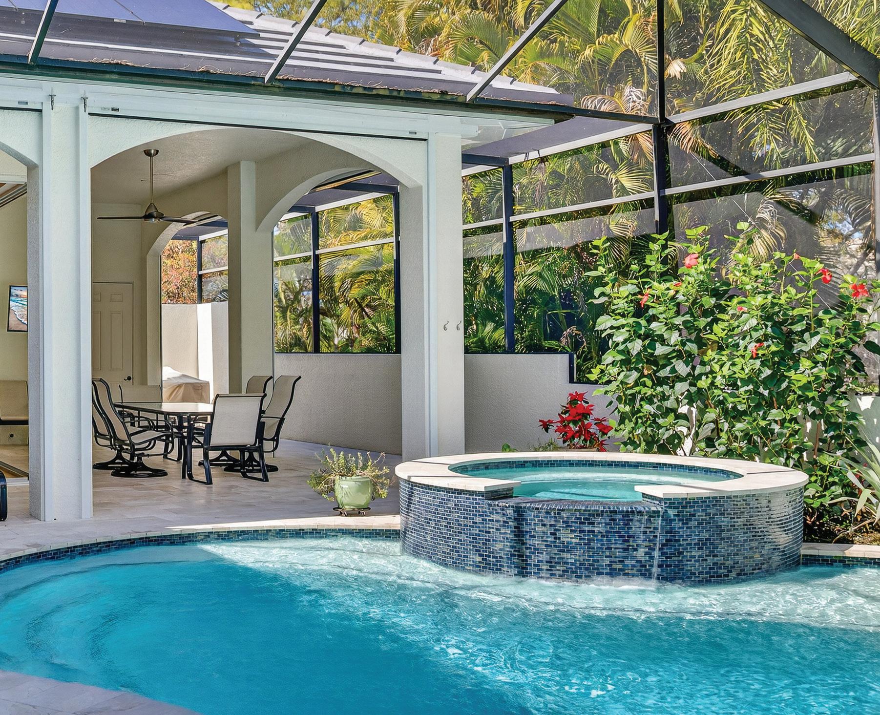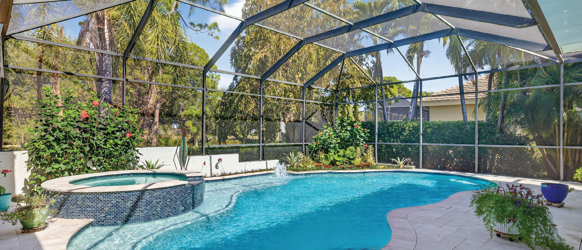 The lanai, an indulgent oasis of its own, showcases a newly resurfaced saltwater pool and spa with all-new pool equipment and a propane heater, along with a stunning new marble pool deck installed in 2025. Complementing the protection provided by 2006 construction standards and impact windows, newly installed MagnaTrack hurricane-rated screens, controlled by a hand-held controller or remotely through an app, provide security and peace of mind while preserving the view of the 13th green of the Signature Joe Lee 18-hole golf course without compromising privacy. A secluded outdoor shower adds to this sophisticated, resort-inspired living. A fenced-in dog run, professional landscaping, and a multitude of mature trees complete the lush, redesigned grounds. Designed with full-house resiliency in mind, the home features a new roof and solar panels installed in 2024, complemented by four Tesla Powerwall batteries that harness the power of the sun to generate more electricity than the house uses from the electric grid. The system provides complete resiliency during power outages without the need for a generator.