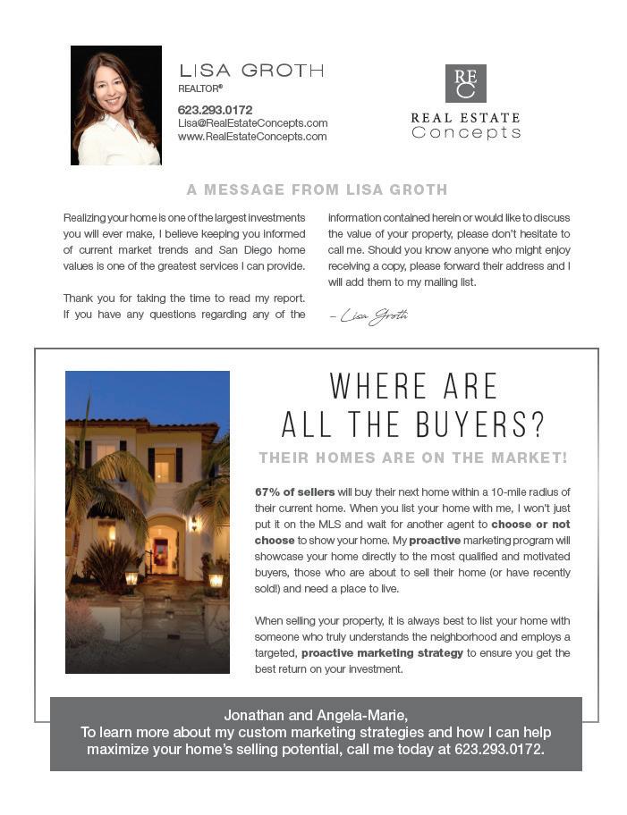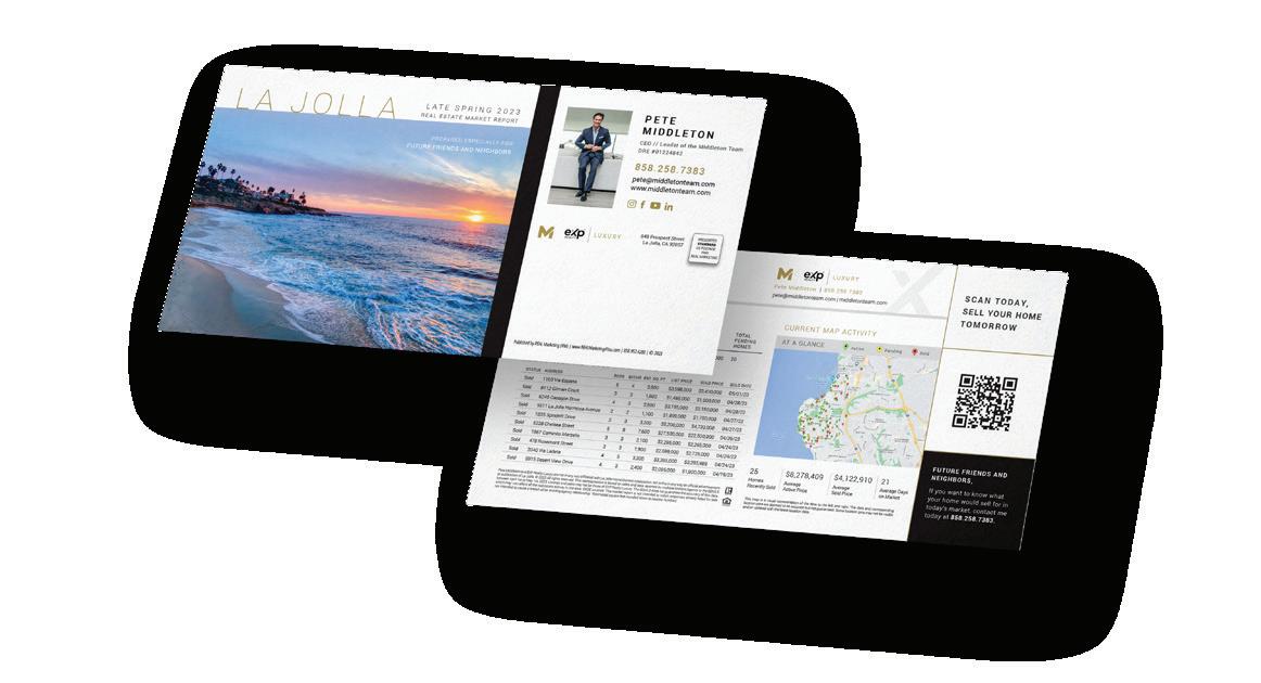 Design Fee: $39.00, waived if mailing to your existing Market Report neighborhood. Mailing lists can either be supplied or purchased. If we need to purchase a mailing list, the list is $0.10 per name For information on custom sizes and print/ship prices, please call 858.265.9798