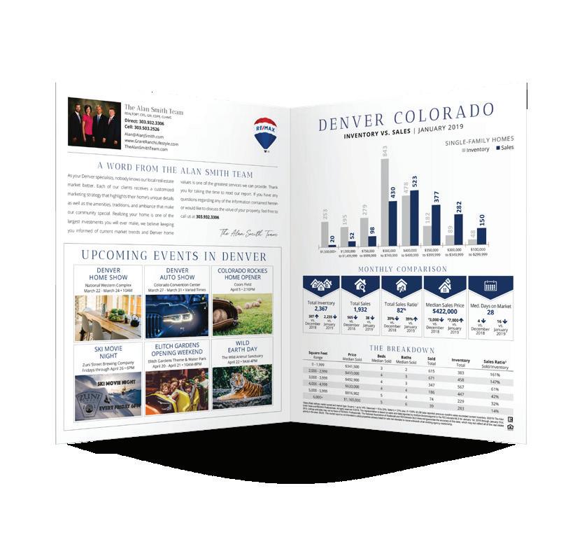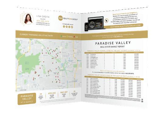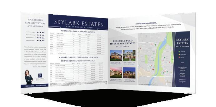 This product is worked on monthly between the agent and their assigned designer. Monthly MLS data will be pulled, relevant market content will be suggested, and since this product is fully customizable, design changes are available upon request. ~$0.52/piece