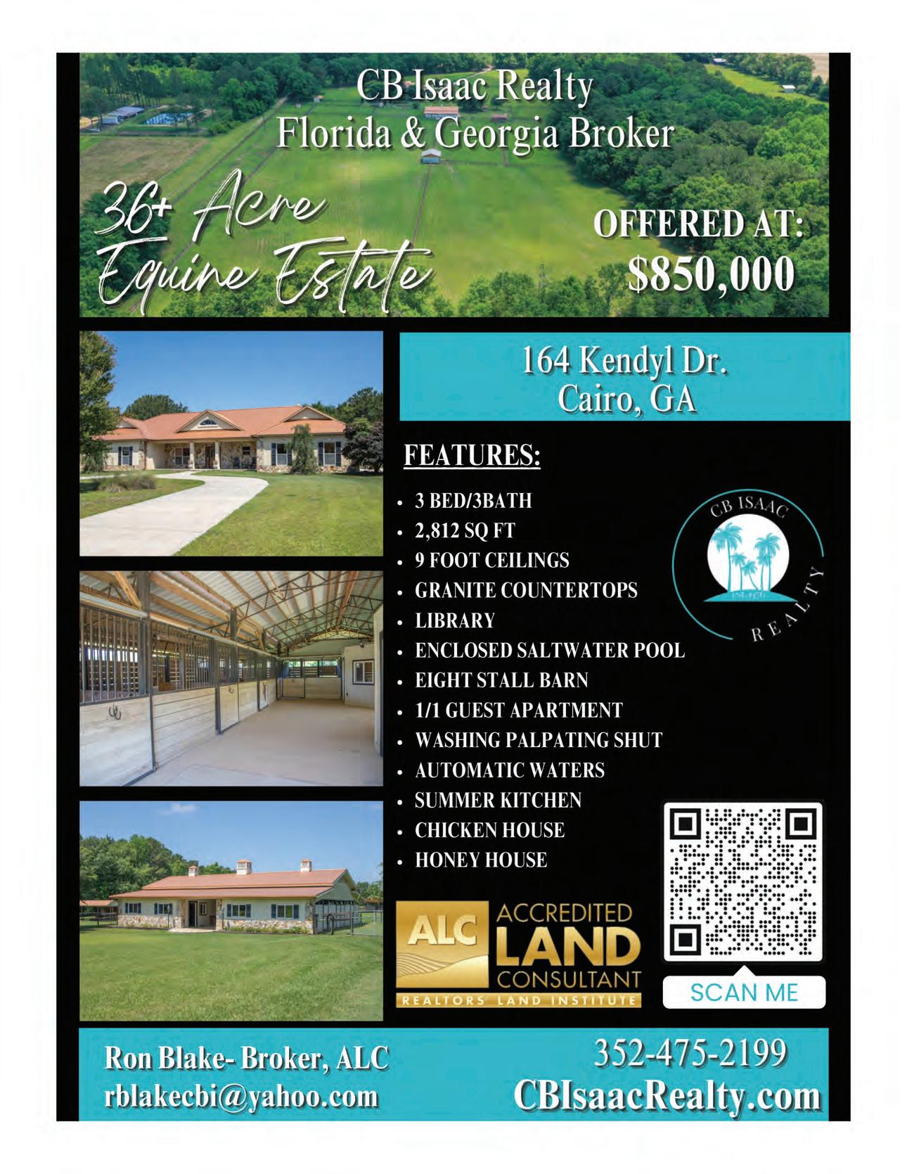 Webster Training Center 3825 NW 160th Street, Reddick, FL 32686 ••• Contact for Pricing ••• OM657780 Indian Prairie Ranch 6853 NE 90Th Street Road, Anthony, FL 32617 ••• Contact for Pricing ••• OM653648 Call me for more information! Beckie Cantrell REALTOR® 352.812.6784 | E-mail Beckie@ShowcaseOcala.com VIRTUAL TOUR VIRTUAL TOUR 36+ acres | 48-stall training center | 5/8 mile irrigated track with 1/2 mile inner turf track 60’ European hotwalker | 6 horse starting gate | Track viewing stand | Fully stocked pond Large workshop | In-ground pool and spa with spacious pool deck | Full camera security system RV hookup on-property for additional accommodations | Full-house generator 185 +/- acre comprehensive training facility | 5,645 sq. ft. main home | 3 additional residences 4 barns - 48 stalls total | Numerous paddocks and pastures with additional room for expansion Eurocizer and two round pens | 1/2 mile irrigated dirt track with starting gate Exercise room with sauna | In-ground saltwater pool with gas heating | Cabana with pergola www.ShowcaseOcala.com • 5780 SW 20th Street, Ocala FL 34474 Copyright © 2023 NewPoint Franchisor, LLC