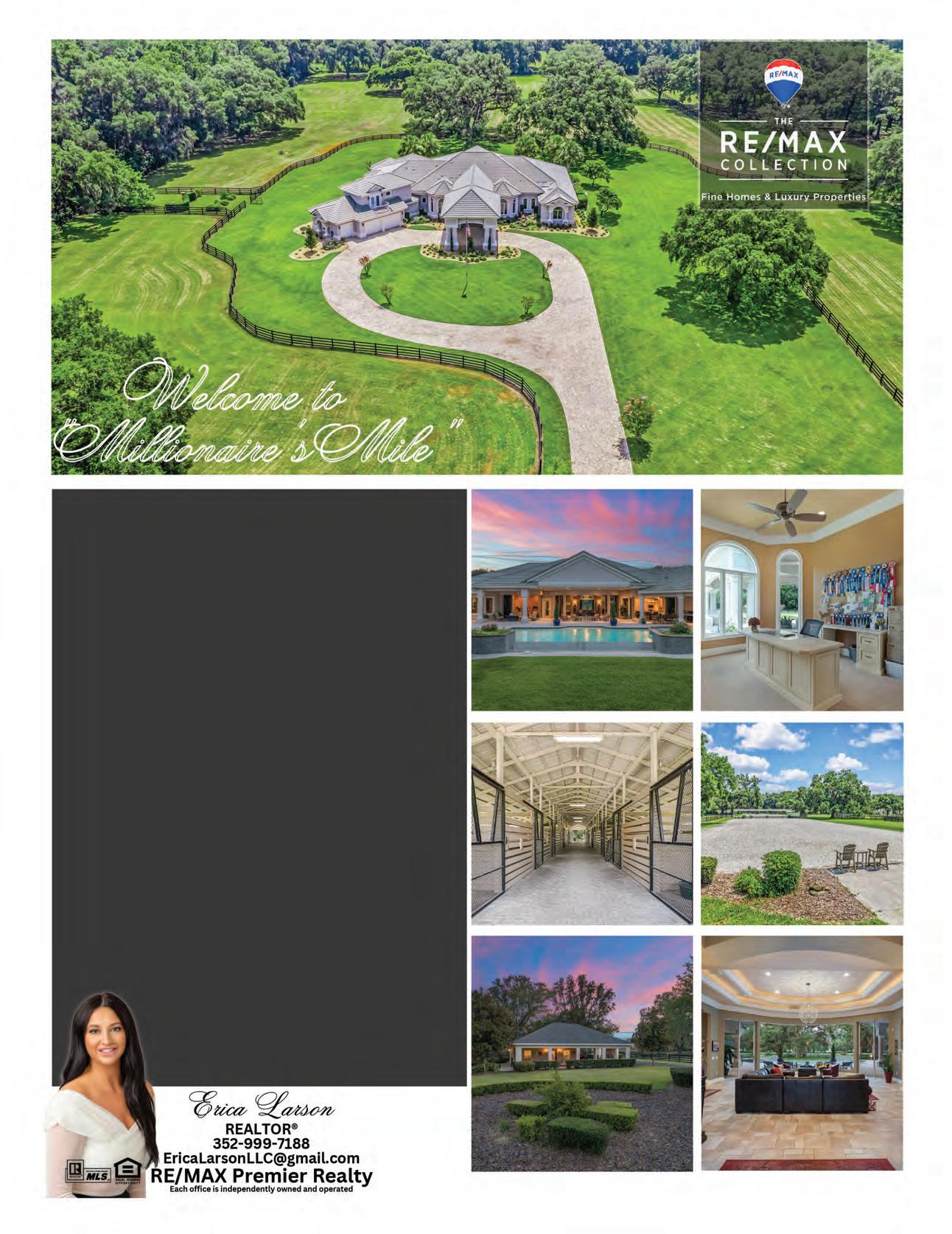 For the Best Results in Acreage, Farms, Equestrian Estates, Residential Sales & Investments Kathleen Miller Roberts Real Estate 352.362.1515 KathleenMillerPropertie@ gmail.com Exceptional Service in Ocala Luxury Real Estate See my ad • page 26 Alyssa Pascucci Golden Ocala Real Estate 310.926.8527 alyssa.pascucci@ goldenocalarealestate.com Your trusted Real Estate Advisor. Exclusive brokerage of World Equestrian Center Cory Freilich RE/MAX Premier Realty 352.663.9799 coryfreilich@gmail.com Integrity. Passion. Innovation. See my ad • page 19 George deBenedicty Pegasus Realty & Associates, Inc. 352.895.8900 ocalaranches@gmail.com Over $900 Million Sold See my ad • pages 32 & 33 Matt Varney of the OHP Team Ocala Horse Properties 352.615.7001 matt@ocalahorseproperties.com #1 in farm sales 13 years & counting See our ad • on the Center Spread pages 20 and 21 Claire Khuen Showcase Properties of Central Florida 352.362.0293 CandCKhuen@aol.com Professional REALTOR® with a passion for horses HOMES & LAND OF OCALA MARION COUNTY 6 For Advertising Information Call (352) 236-2787