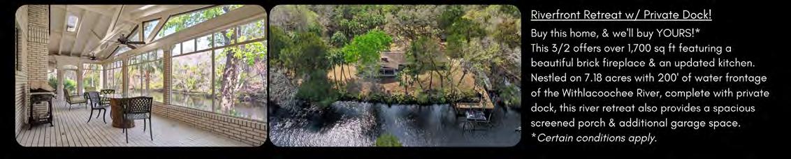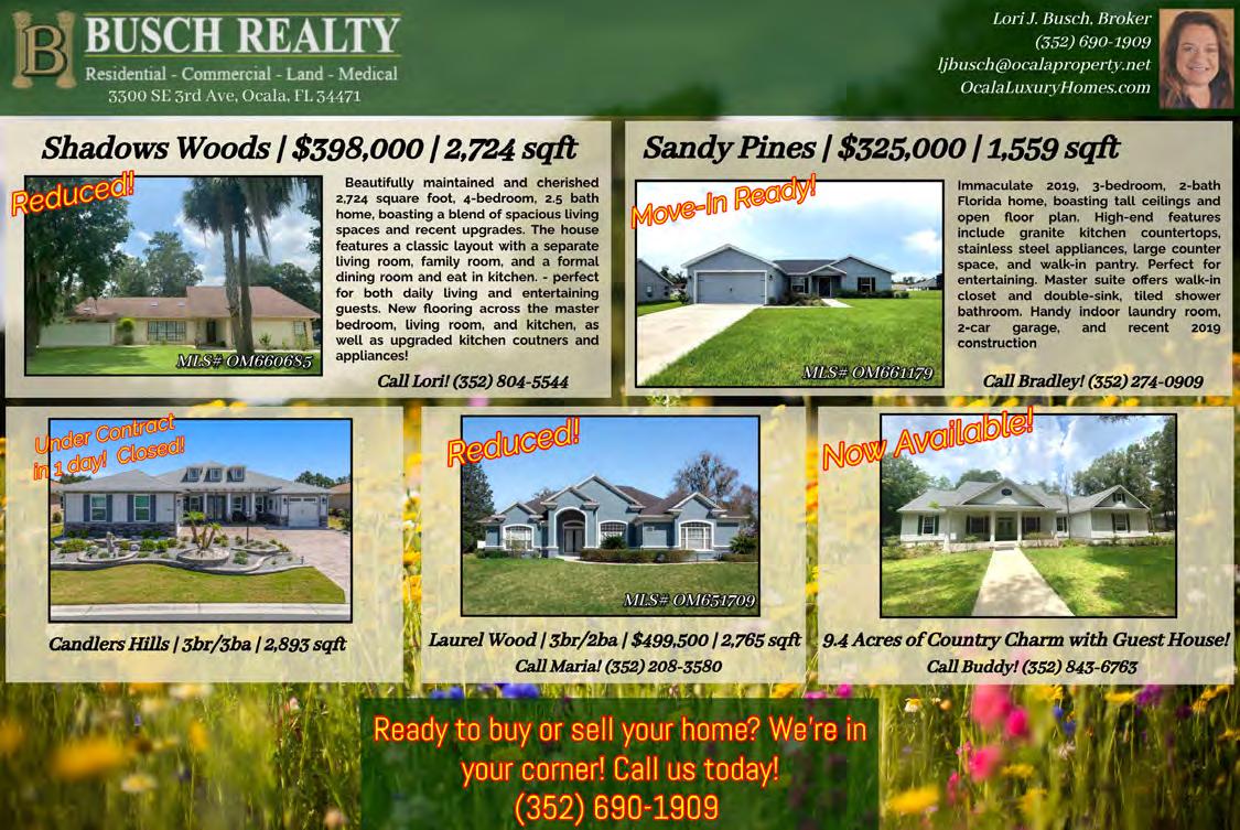 Foxfire realty.com 352.732.3344 615 E. Silver Springs Blvd. | Ocala, FL 34470 Highway 200 office | 352.479.0123 Lady Lake office | 352.750.5110 Summerfield office | 352.307.0304 “We don’t Only work here. We live here!” If your looking for a 55+ Gated Community with... 2- 18 Hole Golf Courses A State-of-the-Art Gym 3 Pools: One Indoor & Two Outdoors Pickle Ball & Tennis Courts Restaurant & Pub, etc. Give us a Call Today. We will Show you around our Beautiful Community and Homes CAROL CASTINEIRA REALTOR® BOB NIEDZWIECKI REALTOR® 352.445.4953 clfl82@yahoo.com BNiedz2000@yahoo.com 352.408.8525 Multi-million Dollar Award Winners Chuck Scott 810.588.2950 chuckscott@foxfirerealty.com “If your thoughts are on Buying, Selling or Relocating, I look forward to speaking with you.” Need to discuss your options? LAND! LAND! LAND! BEAUTIFUL 1.16 ACRES between Ocala and Dunnellon in area of newer homes. $46,500 TWO .24 ACRE LOTS for the price of one!! Buy and build or hold for the future but act now!! $19,000 TURN-KEY 3 BED/2 BATH VILLAGE OF SUMMERHILL Beautiful & Well Maintained Sunkissed Model. Screened-in lanai & enclosed florida room. beautifully landscaped.VLP flooring, no carpet!! Near shopping, restaurants & entertainment. low bond balance. $359,900 RECENTLY UPDATED CB HOME 3 BEDROOMS, 2 BATH, 2 CAR GARAGE completely vinyl fenced back yard. Recently painted and All New: AC unit, Roof, and Windows. The beautiful kitchen is equipped with stainless steel appliances. Enclosed lanai,