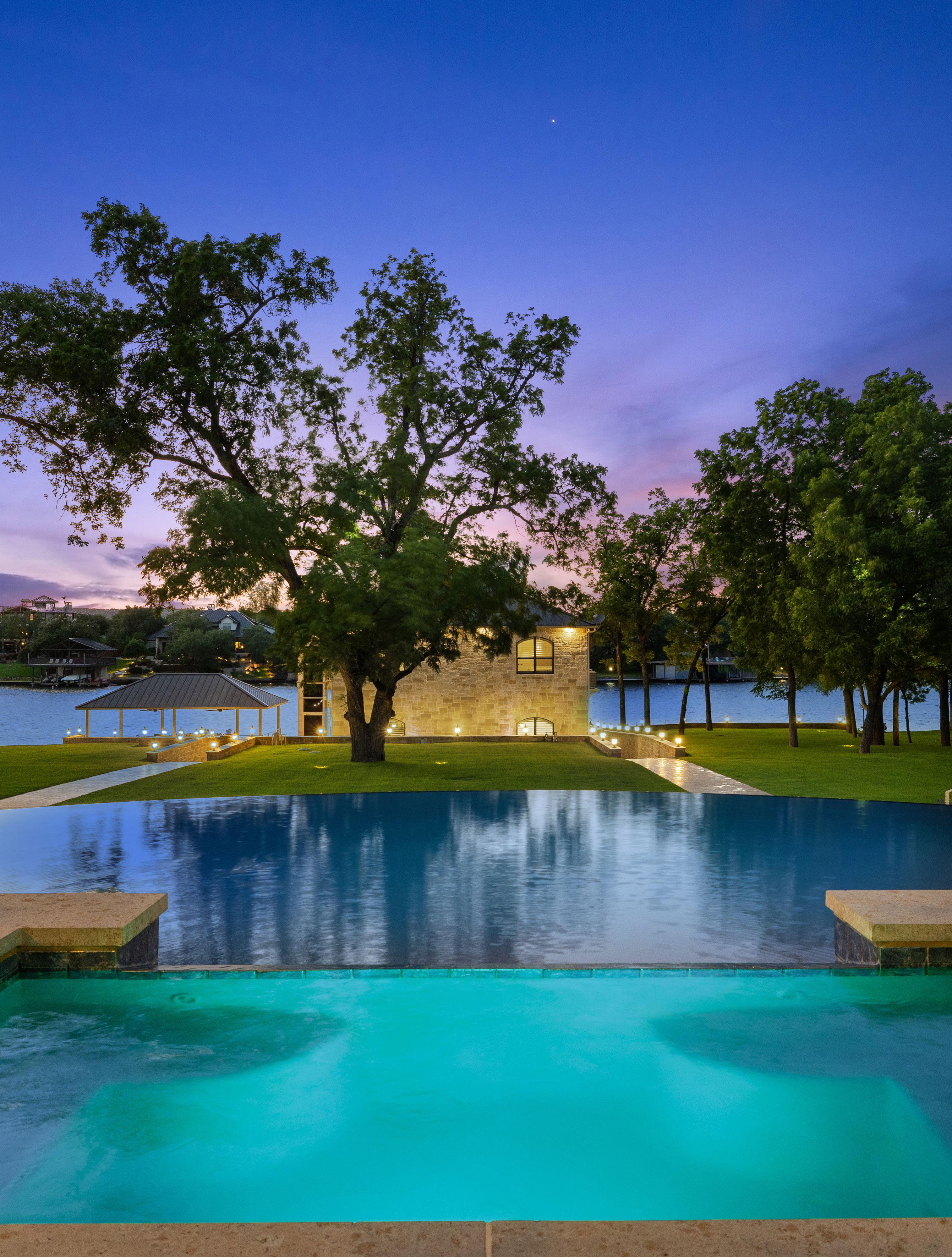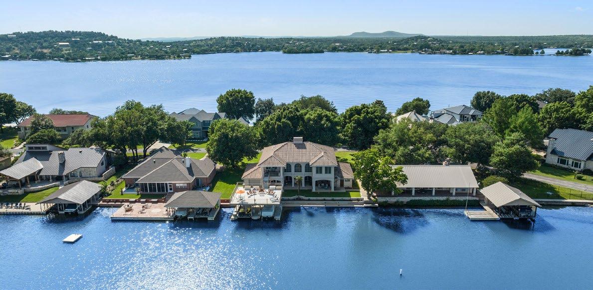 The epitome of Lake LBJ waterfront luxury! This 3.3-acre estate in the gated golf & waterfront community of The Legends offers 250’ feet of breathtaking open waterfront. It features a stunning blue negative-edge pool with a spa and slide, a spacious covered patio, and an extraordinary man cave with a full bar, pool table, and ice cream station. The multi-generational design includes an openconcept main living area, a gourmet kitchen, a theater room, a primary suite with a spa bath, and multiple guest suites. The beautifully landscaped grounds lead to lakeside entertaining areas, a summer kitchen with a BBQ/fire pit, and a boathouse with living quarters and amenities. Constructed in 2020, this 9,788 sq ft estate includes eight bedrooms, nine full baths, two half baths, a five-car garage, offered fully furnished with watercraft, ready to start living your best life on Lake LBJ!