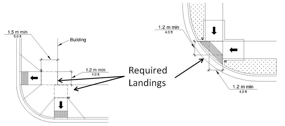 All curb ramps must have a landing at the location where a wheelchair user would have to turn to prepare to enter the roadway. For perpendicular ramps, this means a 4-foot by 4-foot landing at the top of the ramp (5-foot by 5-foot if there is a vertical obstruction adjacent to the landing). For parallel ramps where the sidewalk is depressed, the 4-foot by 4-foot landing is required at the bottom of the ramp.